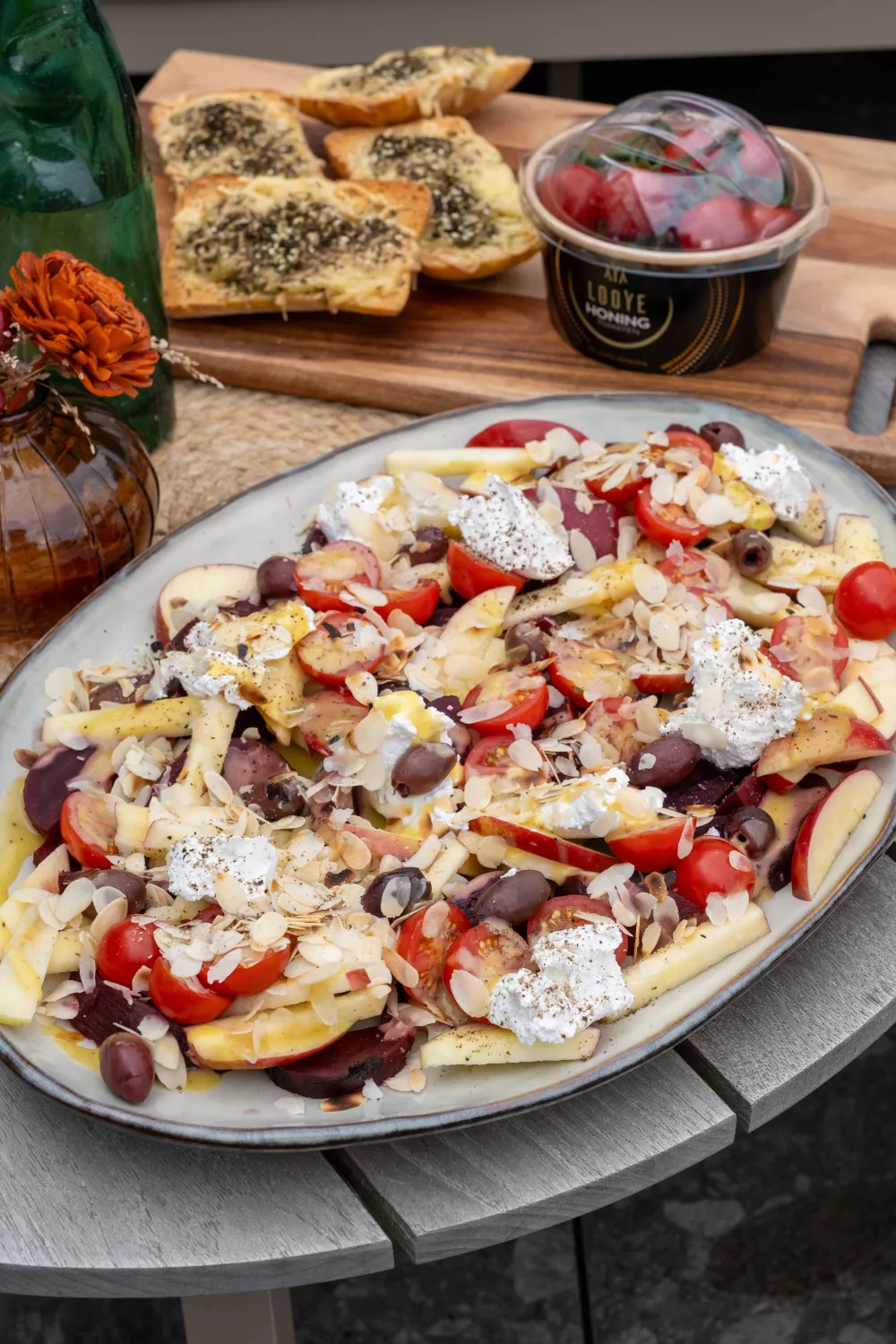 Een frisse salade met zachte geitenkaas en goudbruin geroosterde ciabattabroodjes met geraspte kaas en za'atar, ideaal voor een lichte lunch of zomers diner. Appelblokjes, voorgekookte rode biet, zoete honingtomaatjes en geroosterd amandelschaafsel zorgen voor frisse, aardse en knapperige contrasten. De eenvoudige dressing van honing, mosterd, citroen en olijfolie brengt de Mediterrane smaken van kalamata olijven en za'atar samen.