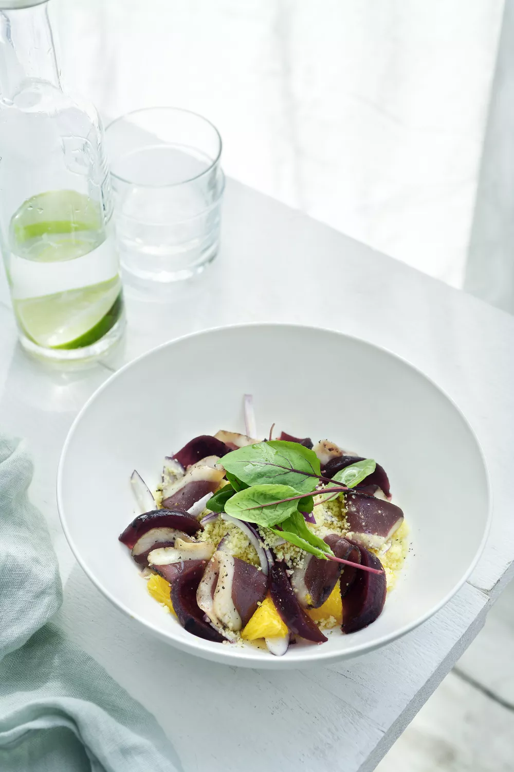 Deze frisse salade combineert gerookte eend met aardse rode biet, zoete sinaasappel en pittige rode ui, afgewerkt met scherpe veldzuring. Luchtige couscous wordt snel opgezet en bindt de smaken tot een lichte, mediterrane salade die perfect is als lunch of elegant voorgerecht. De mix van rokerig vlees en citrus geeft een verfijnde zoetzure balans voor herfst en winter.