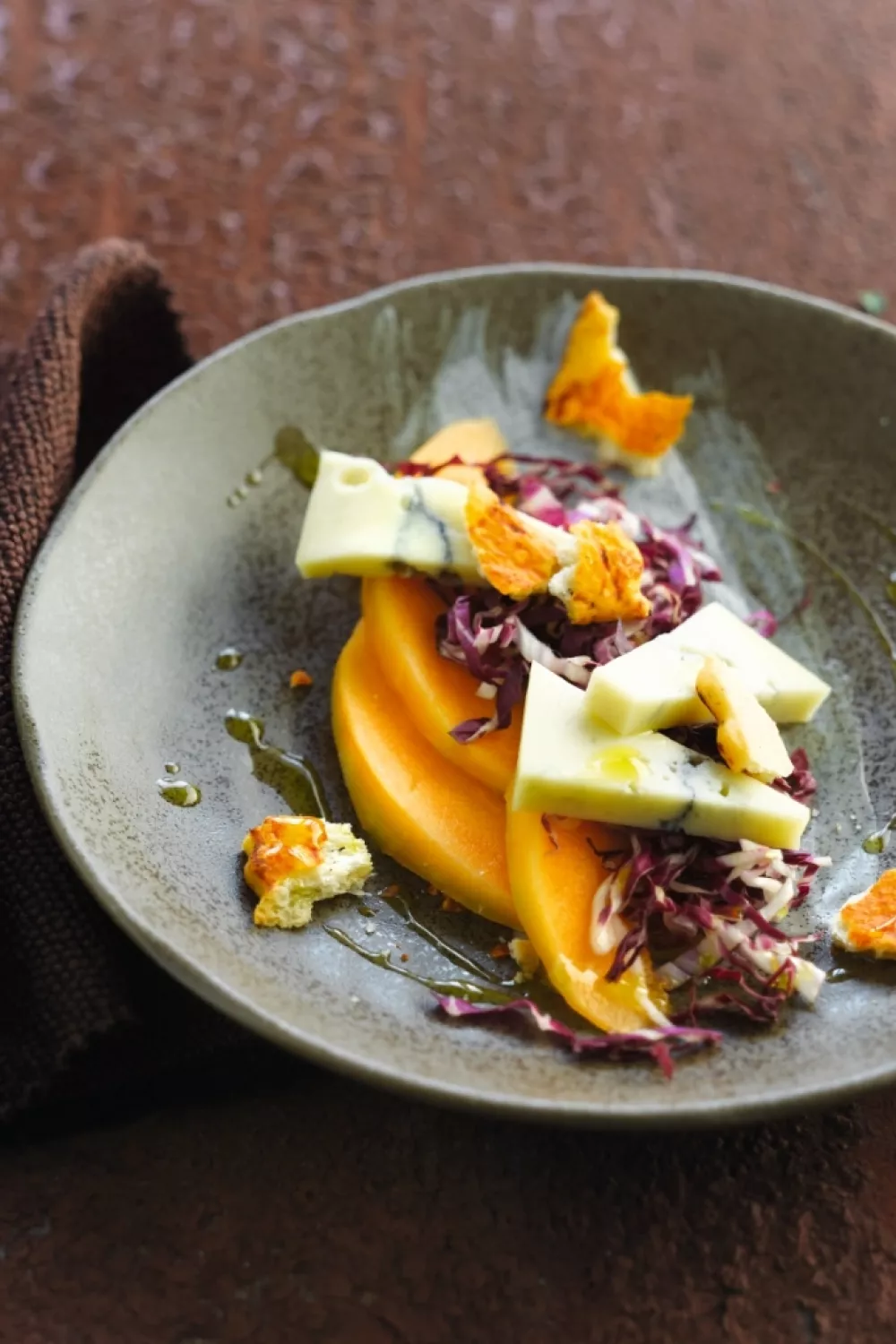Een lichte salade met zoete cavaillonmeloen, bittere radicchio en romige blauwe kaas die mooi contrasteert met krokante aperitiefkoekjes en een frisse citroenvinaigrette. Simpel van opbouw en snel te maken: plakjes meloen en fijne reepjes radicchio, kaas in stukjes en koekjes verkruimeld over het bord. Perfect als zomerse lunch of licht voorgerecht bij een borrel.