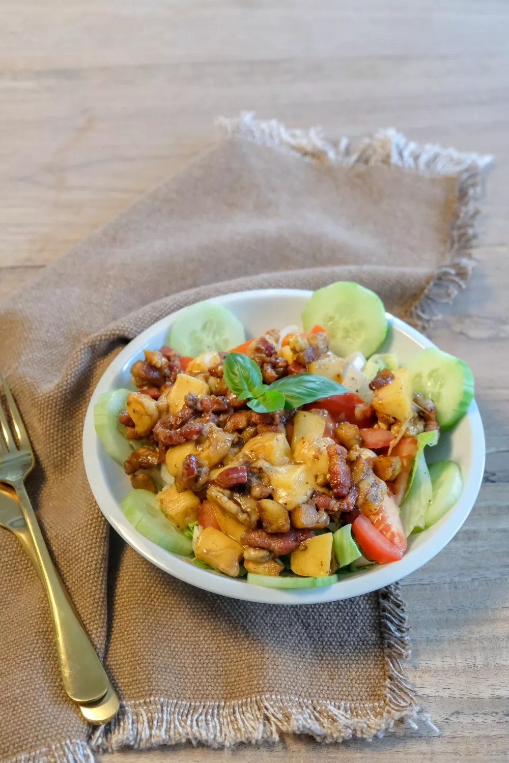 Deze frisse salade met krokant gebakken spek, gekarameliseerde appel en kaasblokjes brengt een fijne balans tussen hartig en zoet. Spek, appels en noten worden in honing gebakken en met balsamico geblust voor een warme, glanzende topping die contrasteert met ijsbergsla, komkommer en tomaat. Perfect als snelle lunch, lichte avondmaaltijd of kleurrijk bijgerecht bij een borrel.