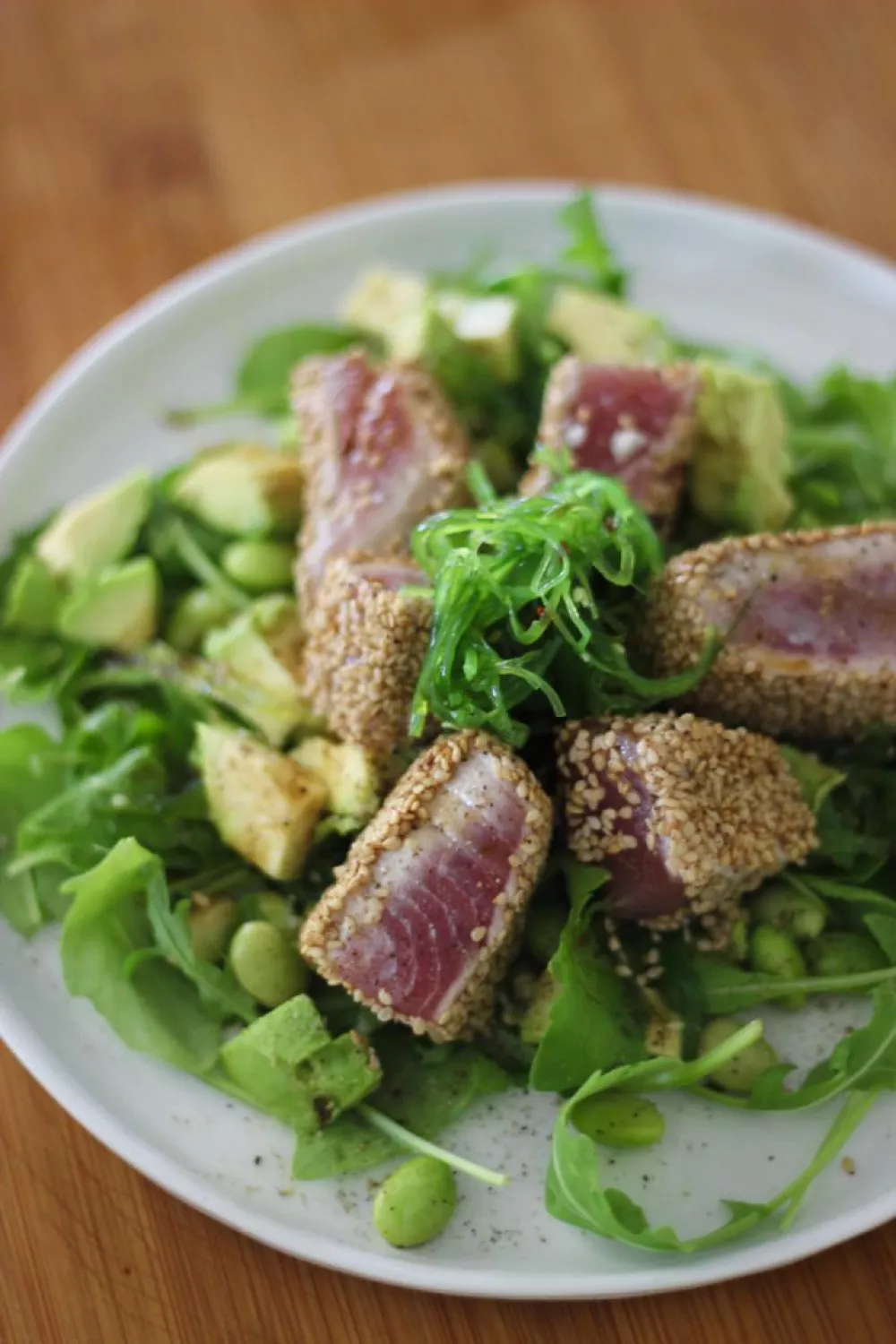 Frisse salade met knapperige rucola, edamame, romige avocado, umami van wakame en eiwitrijke tonijn voor een snelle Aziatisch geïnspireerde lunch. De tonijn wordt kort in kokosolie aangebakken en door sesamzaadjes gerold voor een nootachtige crunch. Werk af met tamari voor een zoute touch en serveer als lichte zomermaaltijd of gezonde lunch.