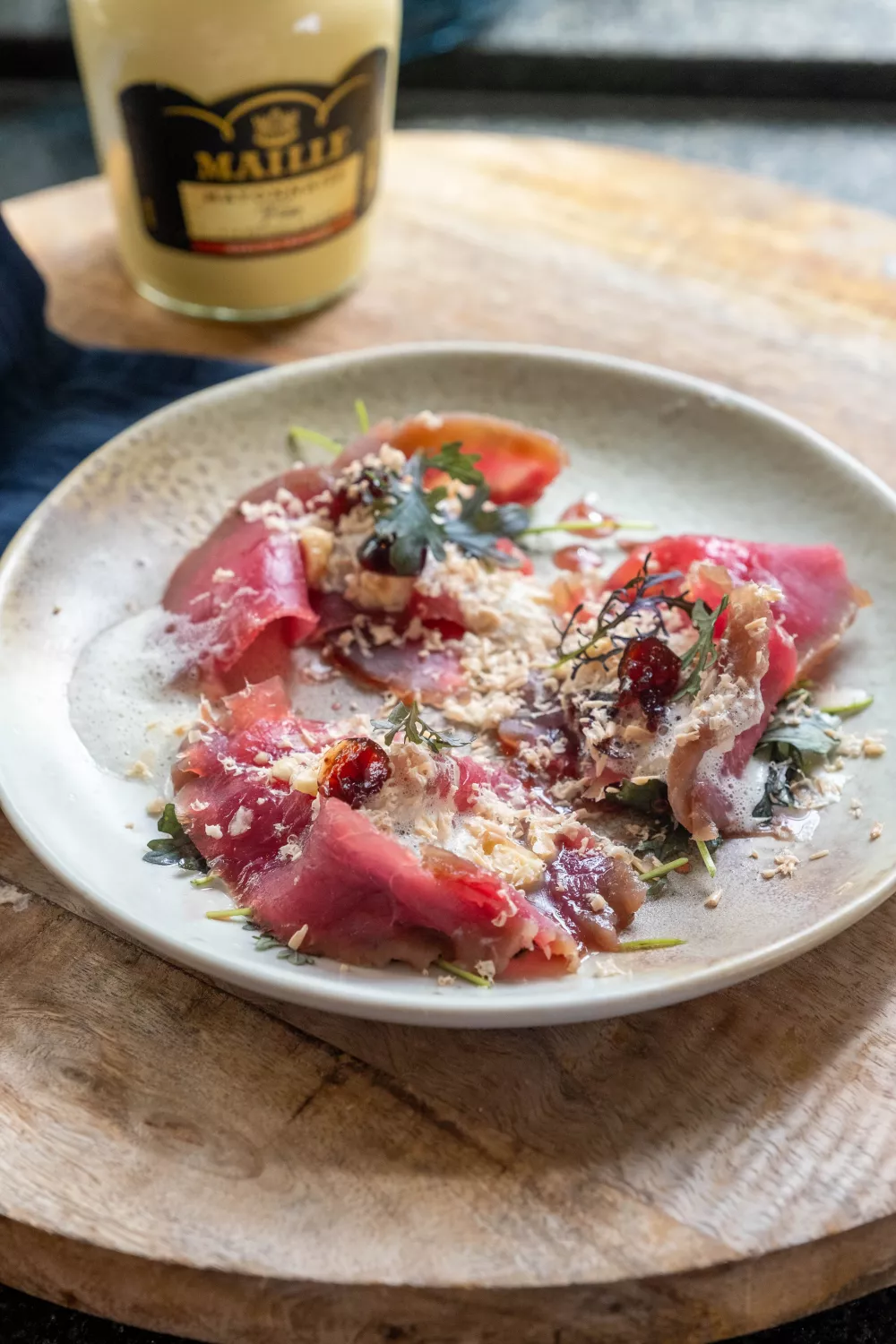 Deze Salade Piemontese combineert flinterdunne plakjes in zout gepekeld kogelbiefstuk met pittige rucola, Leidse komijnkaas en een romige kaassaus op basis van karnemelk voor een verfijnde Italiaanse starter. De biefstuk rijpt twee dagen in een kruidenzoutmengsel voor geconcentreerde smaak, terwijl geroosterde hazelnoten en amarenakersen zorgen voor crunch en zoetzure tegenhangers. Perfect als elegant voorgerecht bij zomerse diners of als feestelijke antipasto.