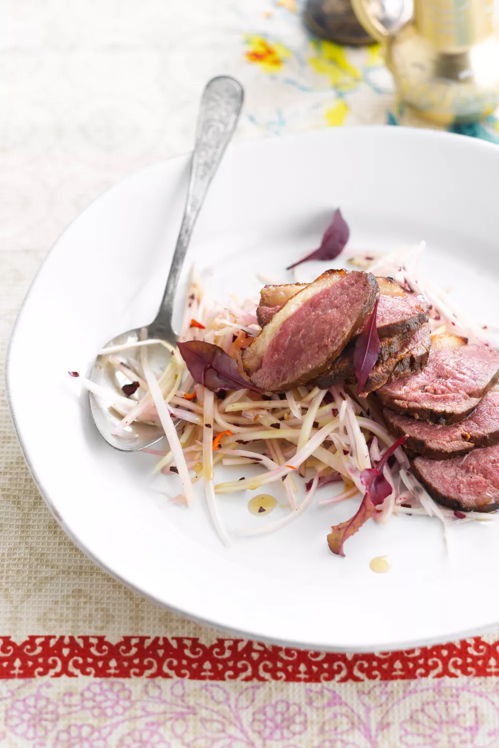Schik de papajasalade op een oosters aandoend bordje. Leg er de plakjes eendenborst mooi rond.