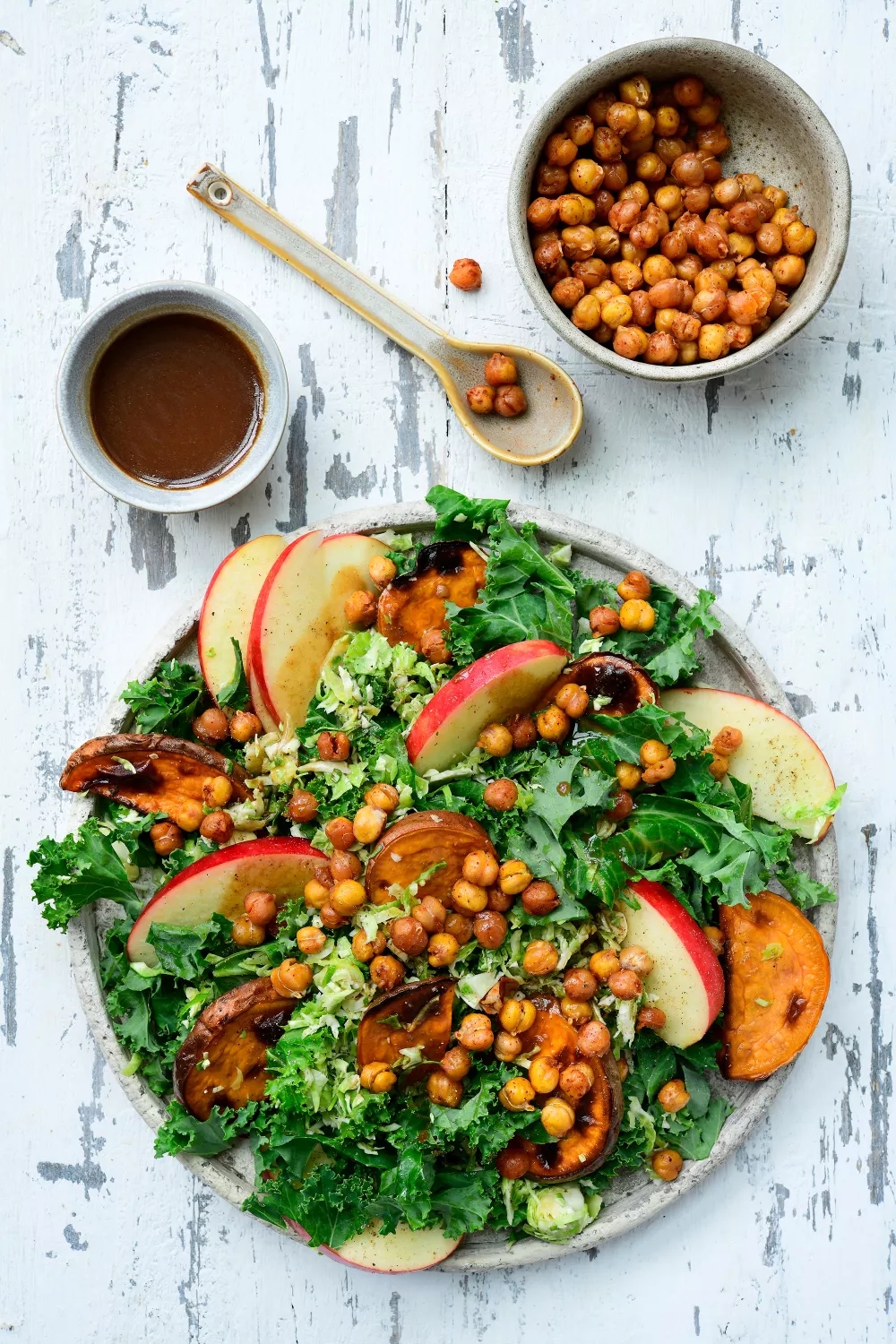 Frisse, kleurrijke salade met rauwe flinterdunne spruitjes, stevige boerenkool en zachte geroosterde zoete aardappel. Krokante kikkererwten op smaak gebracht met ras el hanout en een honing en mosterd vinaigrette met balsamico geven een warm kruidig en lichtzoet contrast. Perfect als voedzame lunch of bijgerecht in herfst en winter, snel klaar door ovenroosteren en simpel snijwerk.