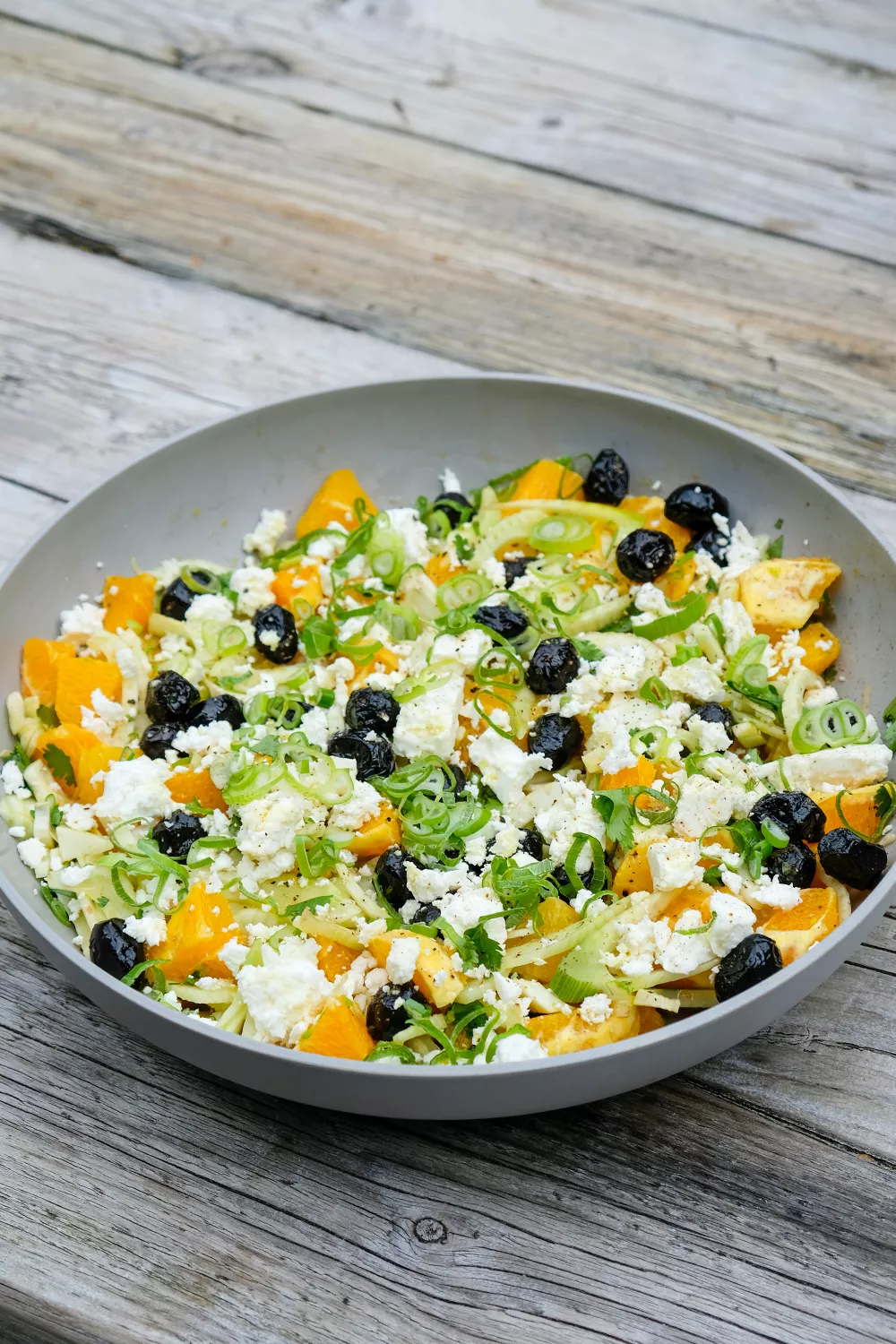 Deze frisse, Mediterraans geïnspireerde salade combineert sappige sinaasappel met knapperige venkel, zoute olijven en romige feta. De venkel wordt kort gemarineerd in olijfolie, witte wijnazijn, dille en lenteui zodat hij zacht en smaakvol wordt en de smaken goed intrekken. Perfect als lichte lunch, bij zomerse barbecues of als kleurrijk bijgerecht.