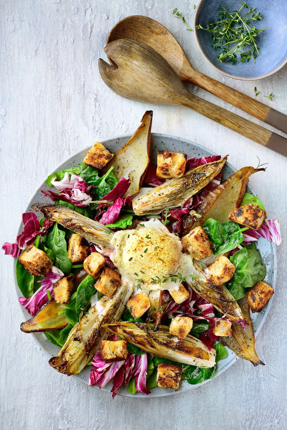 Salade van witloof, peer en geitenkaas met croutons van rozijnenbrood