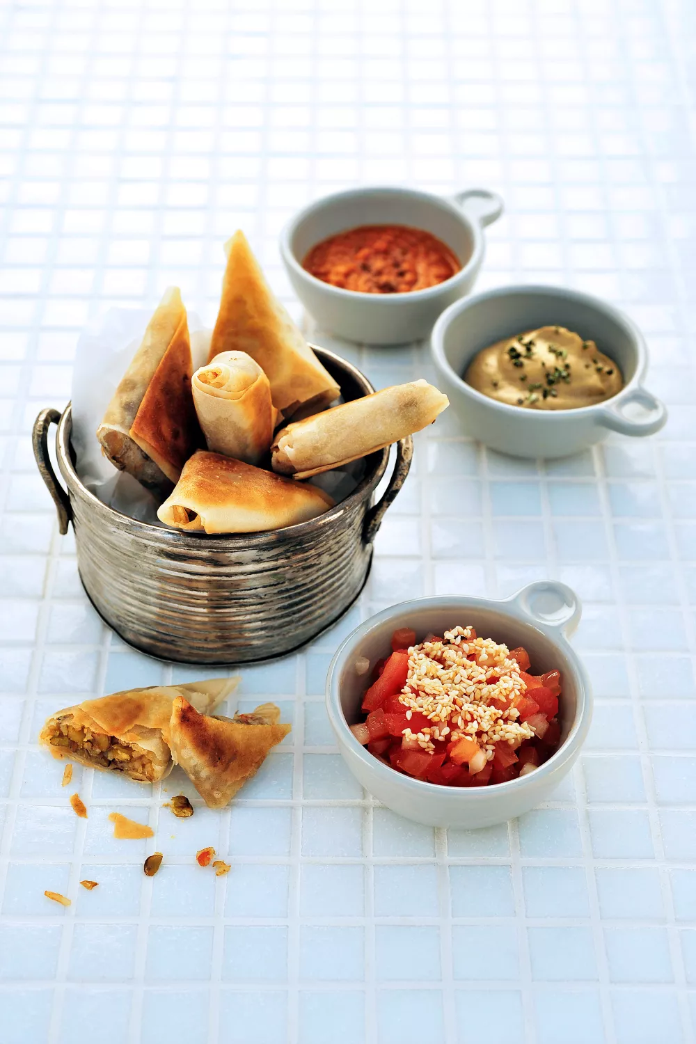Laat de samosa’s nog even uitlekken op keukenpapier en dien ze op met de auberginecrème, tomatensalsaen harissaals dipsausjes.