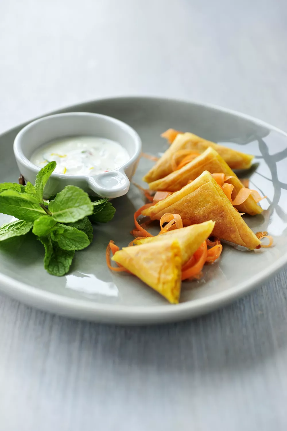 Serveer de samosa’s met de dipsaus en de wortelschilfers.