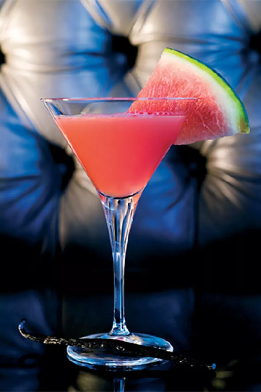 Strain de cocktail in het martiniglas en garneer met een partje watermeloen.