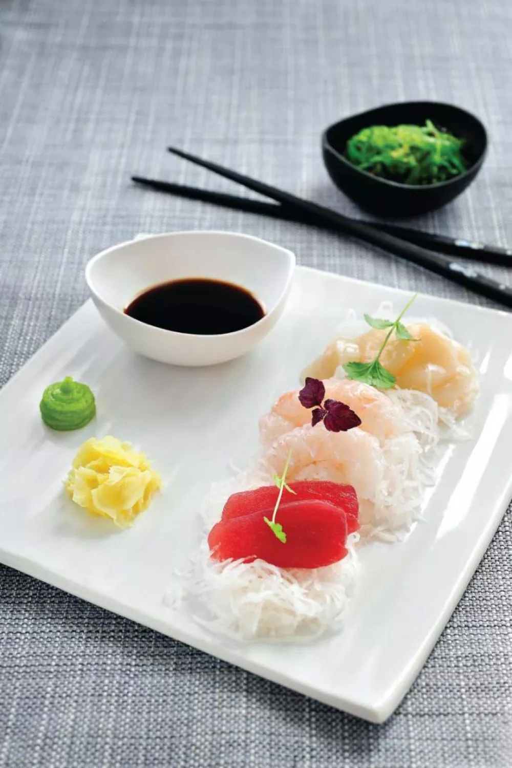 Serveer de sashimi met het geweekte zeewier, de zwarte radijs, wasabi en sojasaus.