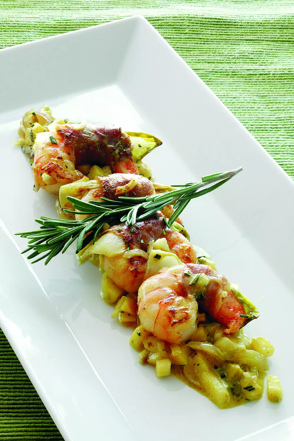 Sappige scampi in een jasje van witloof en Gandaham krijgen kleur in boter en gaan daarna kort de oven in. De romige curry met kokosmelk, Kerala kerrie en rozemarijn omarmt zoete Jonagold en sjalot voor een geurige bite. Ideaal als feestelijk voorgerecht of hartig borrelhapje in de herfst en winter, en verrassend snel klaar.