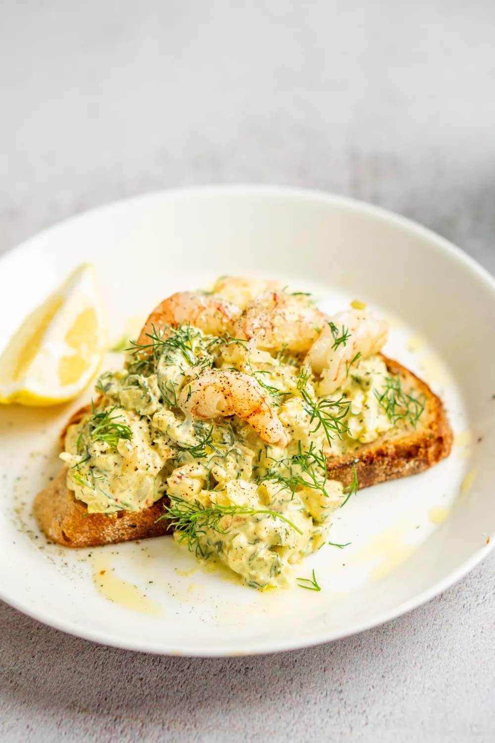 Lepel het garnalenmengsel op je getoaste snee brood en leg er nog wat hele garnalen en wat extra dille bovenop. Druppel er wat extra vierge olijfolie op en serveer met een partje citroen.