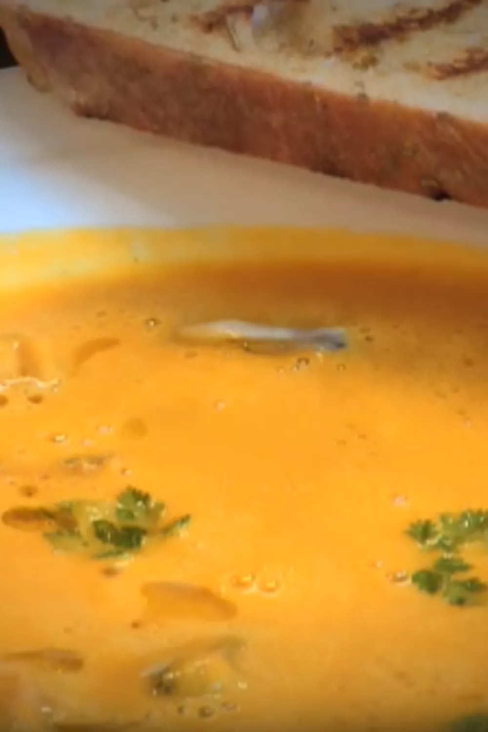 Schuimig pompoensoepje met kokosmelk en mosseltjes
