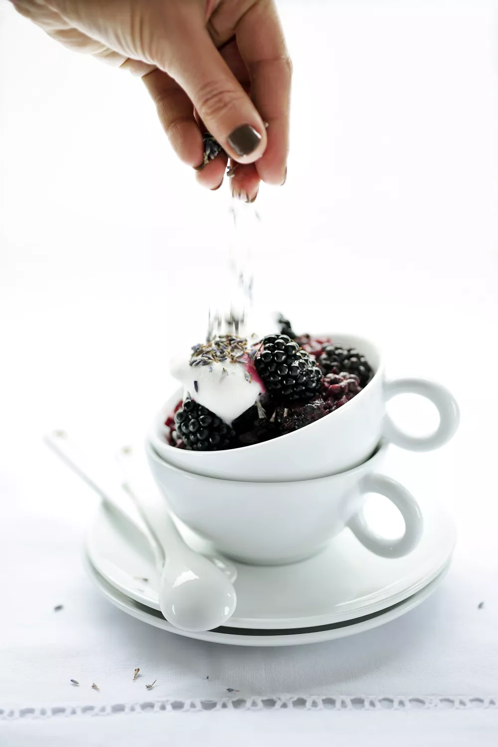 Serveer de lauwwarme bramen en bietjes met een eetlepel schuim en serveer de rest er apart bij. Werk af met wat lavendelbloemetjes.