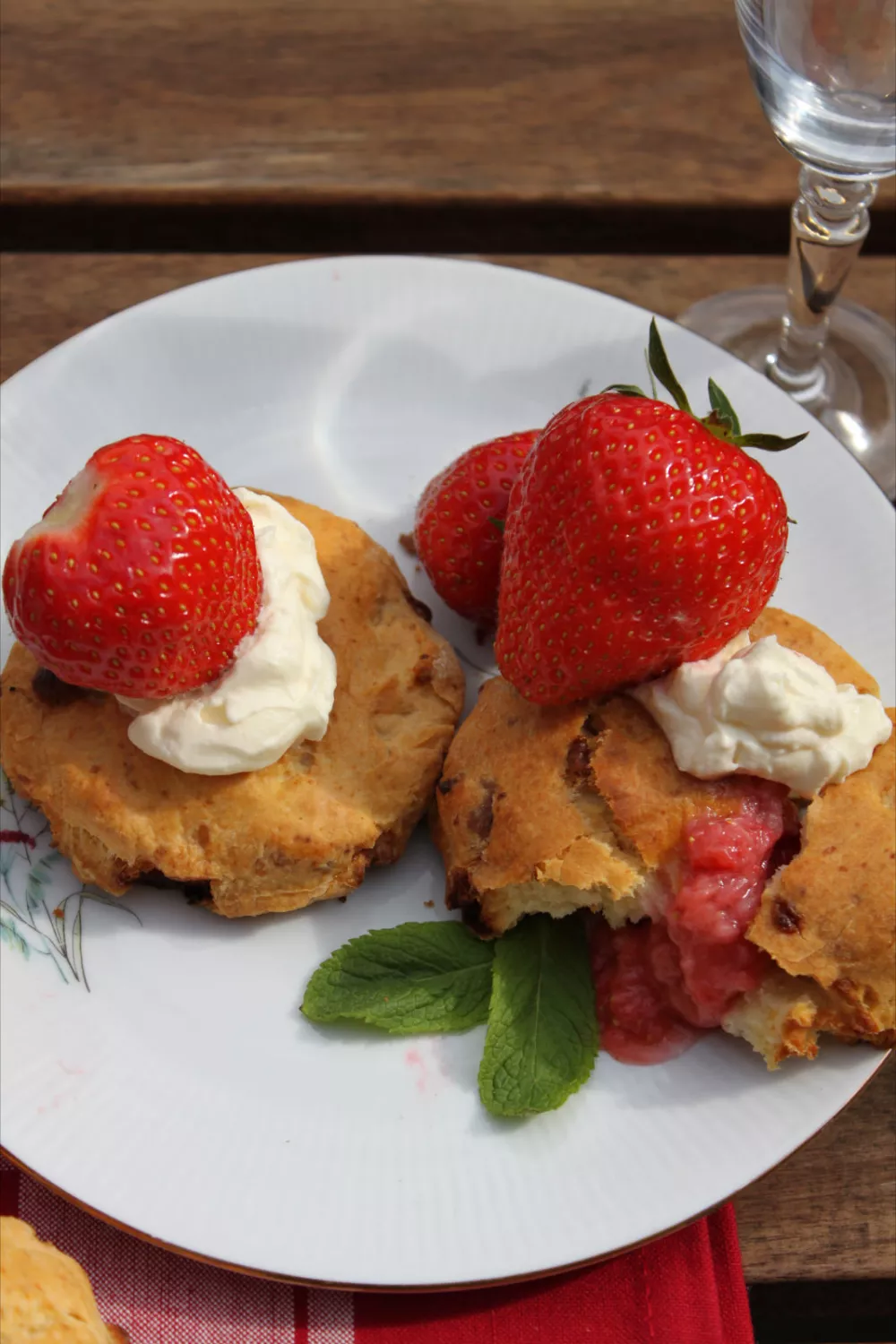 Je kan scones eten als ze nog een beetje warm zijn. Giet het aardbeiensoepje over de scones en tast toe.