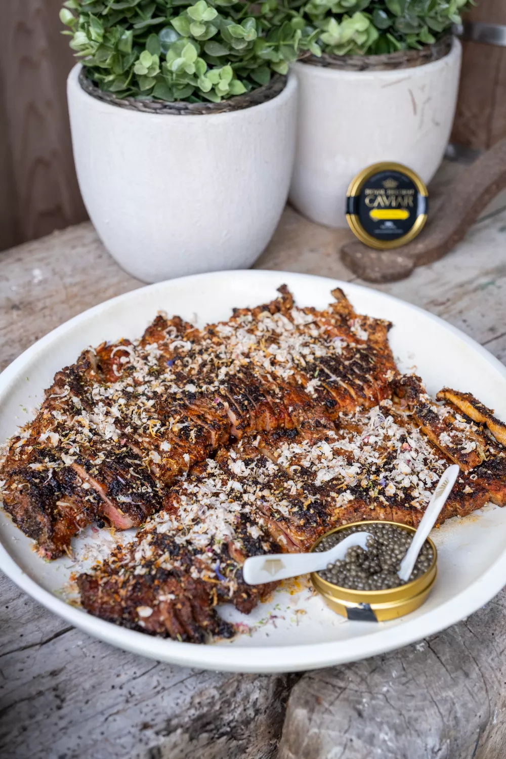 Een feestelijk barbecuegerecht van rosé gegrild Secreto Iberico, gekruid met gerookt paprikapoeder, Provençaalse kruiden en fijngemalen ui en lookpoeder. Dun gesneden en afgewerkt met zeste van limoen, geraspte harde kaas en een decadente toets van Osietra kaviaar en kaviaartruffel voor een ziltige truffelromigheid. Perfect voor zomerse diners en speciale gelegenheden waarbij grilltechniek en luxe ingrediënten samenkomen.