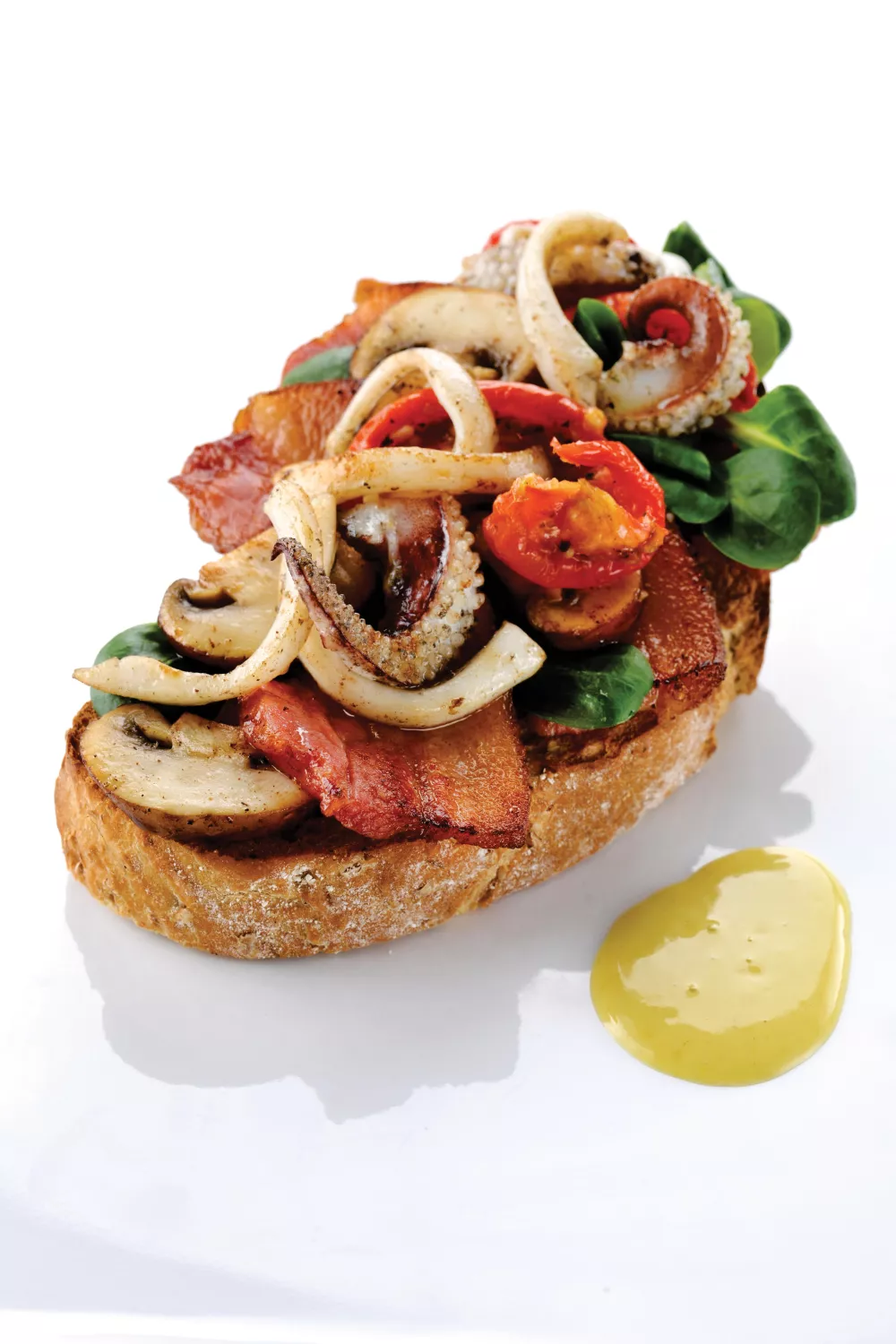 Snijd de inktvis in kleinere stukjes. Bak ze gedurende ongeveer 2 minuten gaar in een bodem olijfolie. Snijd vier dikke sneden van een grijs boerenbrood. Borstel er aan beide zijden een beetje olijfolie op en toast ze onder de ovengrill.Snijd de champignons in dikke schijven. Bak de plakken spek en de champignons bruin en krokant in een bodempje olijfolie.Start dan de opbouw van de boterham: leg de snede brood op een bordje, schik er ¼ van het spek en de champignons op, steek er wat gekonfijte tomaatjes tussen en beleg dit alles met blaadjes veldsla.Herhaal dit alles nog eens en leg er dan gebakken stukjes inktvis op. Strooi er een beetje grof zout over en draai er een beetje peper van de molen op.Vinaigrette: