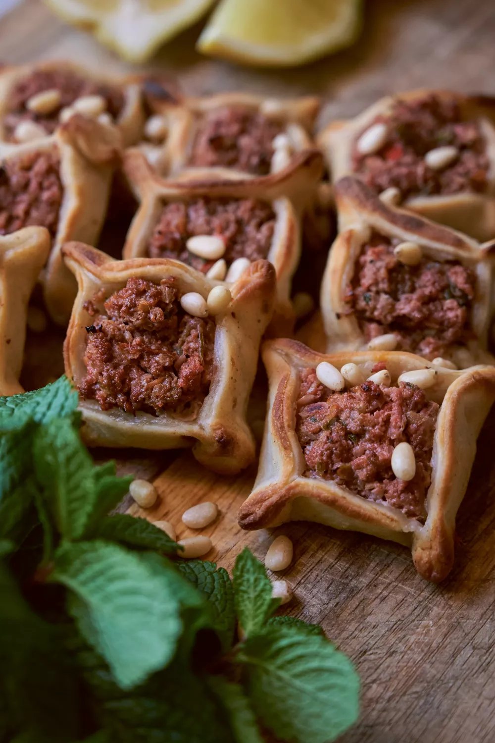 Bak de sfiha’s in de voorverwarmde oven gedurende 15 à 20 minuten, of totdat het deeg goudbruin is.