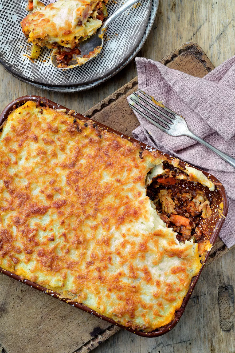 Deze hartige shepherds pie met linzen en varkens kalfsgehakt is een troostrijke ovenschotel met romige aardappelpuree en een goudbruine kaasbovenlaag. Stoof ui, wortel en selder met bruine linzen, harissa en warme specerijen zoals komijn en kaneel voor een kruidige, verwarmende smaak, ideaal voor herfst en winter. Makkelijk te maken voor het hele gezin, even onder de grill voor een knapperige finish.