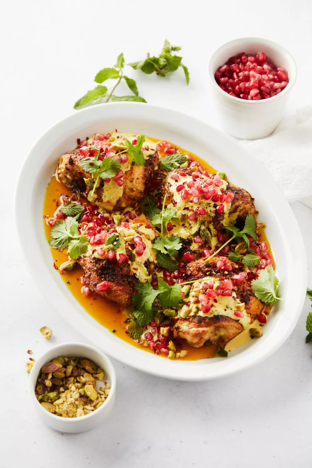 Deze ovengebakken kippendijen met krokant vel combineren Midden-Oosterse kruiden zoals za'atar, kaneel, komijn en chiliflakes voor een warme, aromatische marinade. Een frisse tahinidressing met knapperige pistachenoten en zoete granaatappelpitjes geeft het gerecht een feestelijke touch, perfect voor een doordeweekse avondmaaltijd of als borrelhap. Serveer met verse koriander en munt voor een levendige, seizoensgebonden toets.