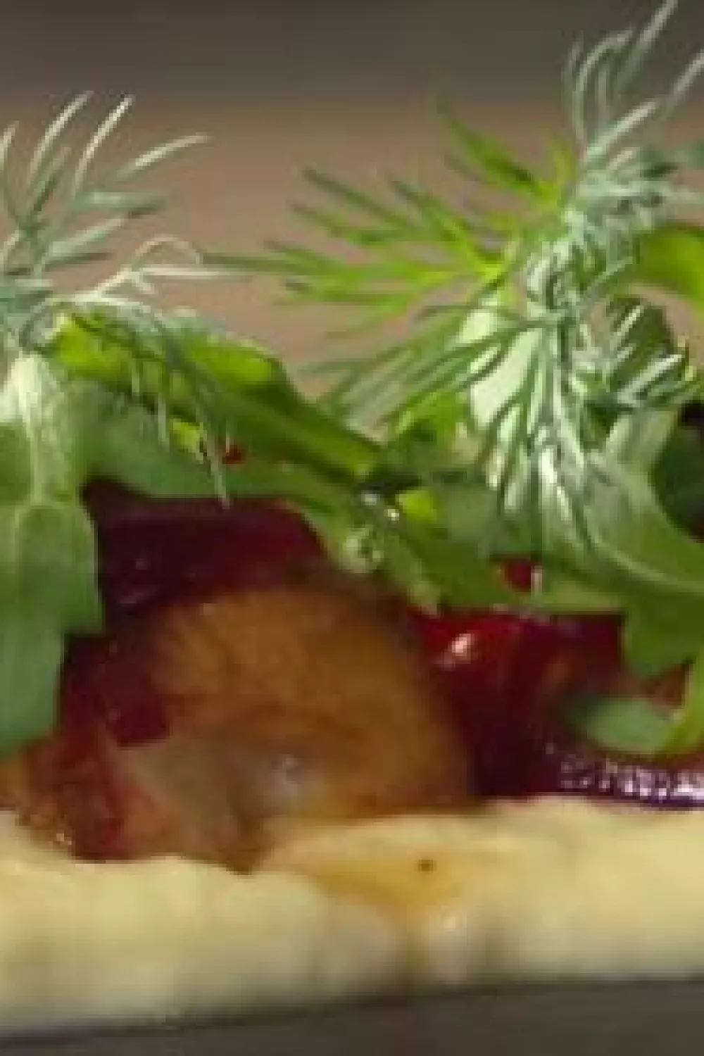 Dresseer de nootjes op een streepje pastinaakpuree en leg daarop de julienne van rode biet. Versier het bord nog met rucola en dille.