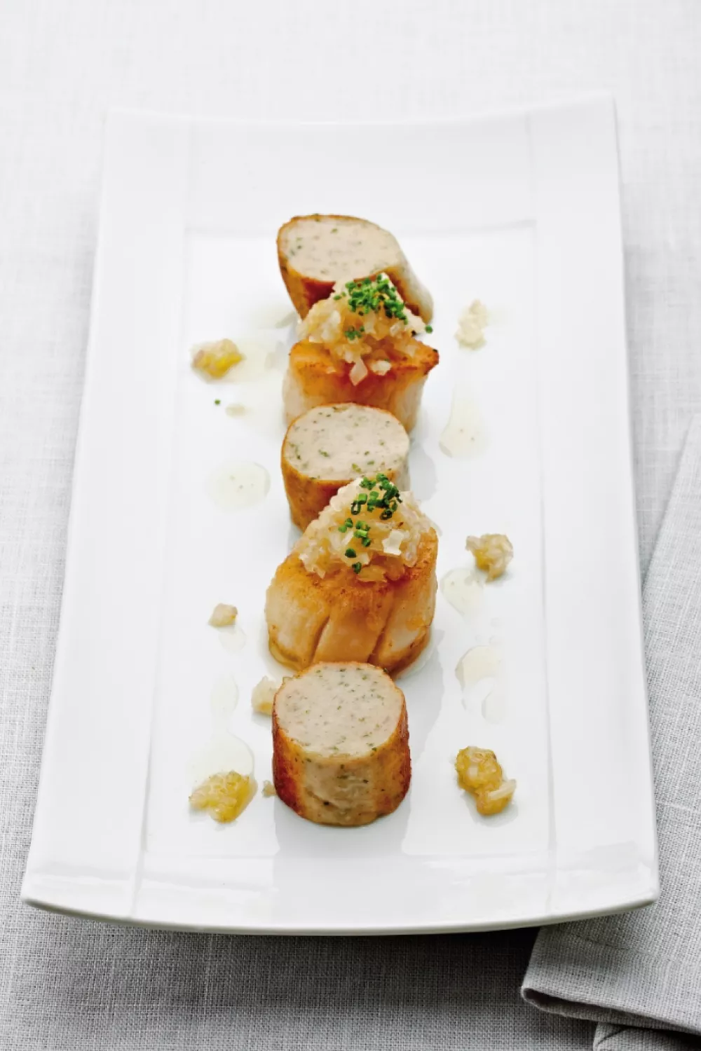 Elegant en snel voorgerecht met sappige Sint Jakobsvruchten en hartige witte pens, afgewerkt met bieslook en klontjes boter voor een romige, volle smaak. De Sint Jakobsvruchten worden kort aangebakken voor een goudbruin korstje terwijl de sjalot glazig wordt gestoofd en de witte pens in plakjes wordt gebakken. Perfect als feestelijk zeevruchten voorgerecht of als winters borrelhapje bij een glas witte wijn.