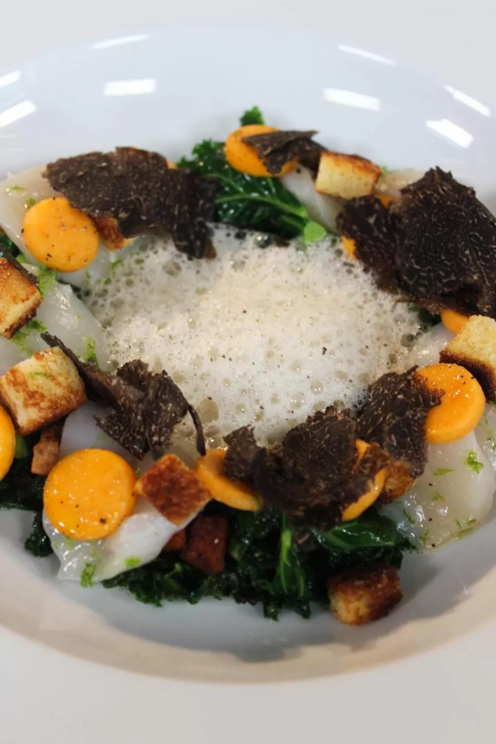 Maak een cirkel van boerenkool op het bord. Leg er de broodkorstjes, stukjes witte pens, plakjes coquille en schijfjes pompoen bovenop. Werk af met de jus van truffel en vers geraspte truffel.