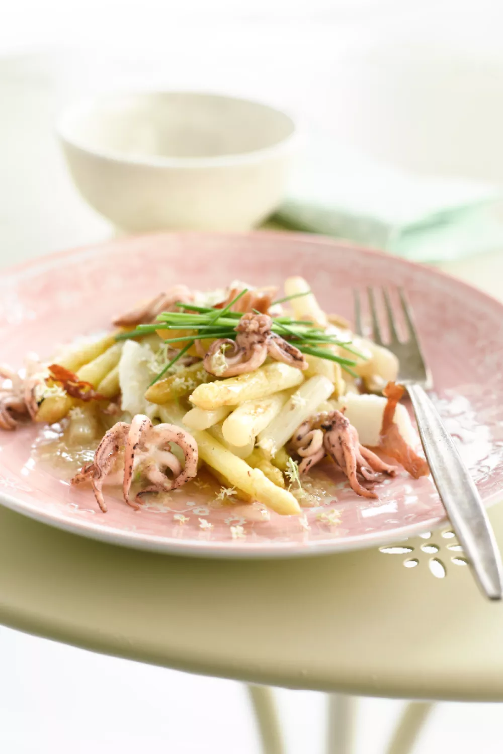Stappenplan om recept “Slaatje met asperges, inktvis en krokante parmaham” te bereiden