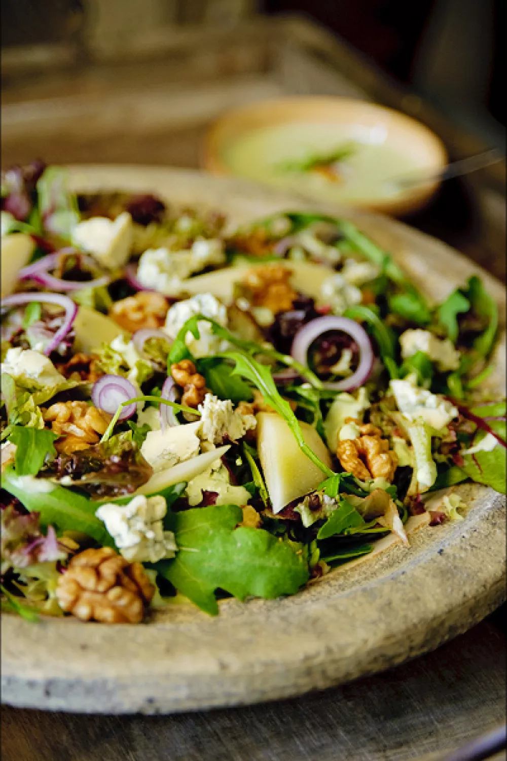 Verdeel de gemengde sla over 4 borden. Leg hier de rode ui, walnoten en partjes peer op. Verkruimel de blauw schimmelkaas erover en besprenkel met de dressing.
