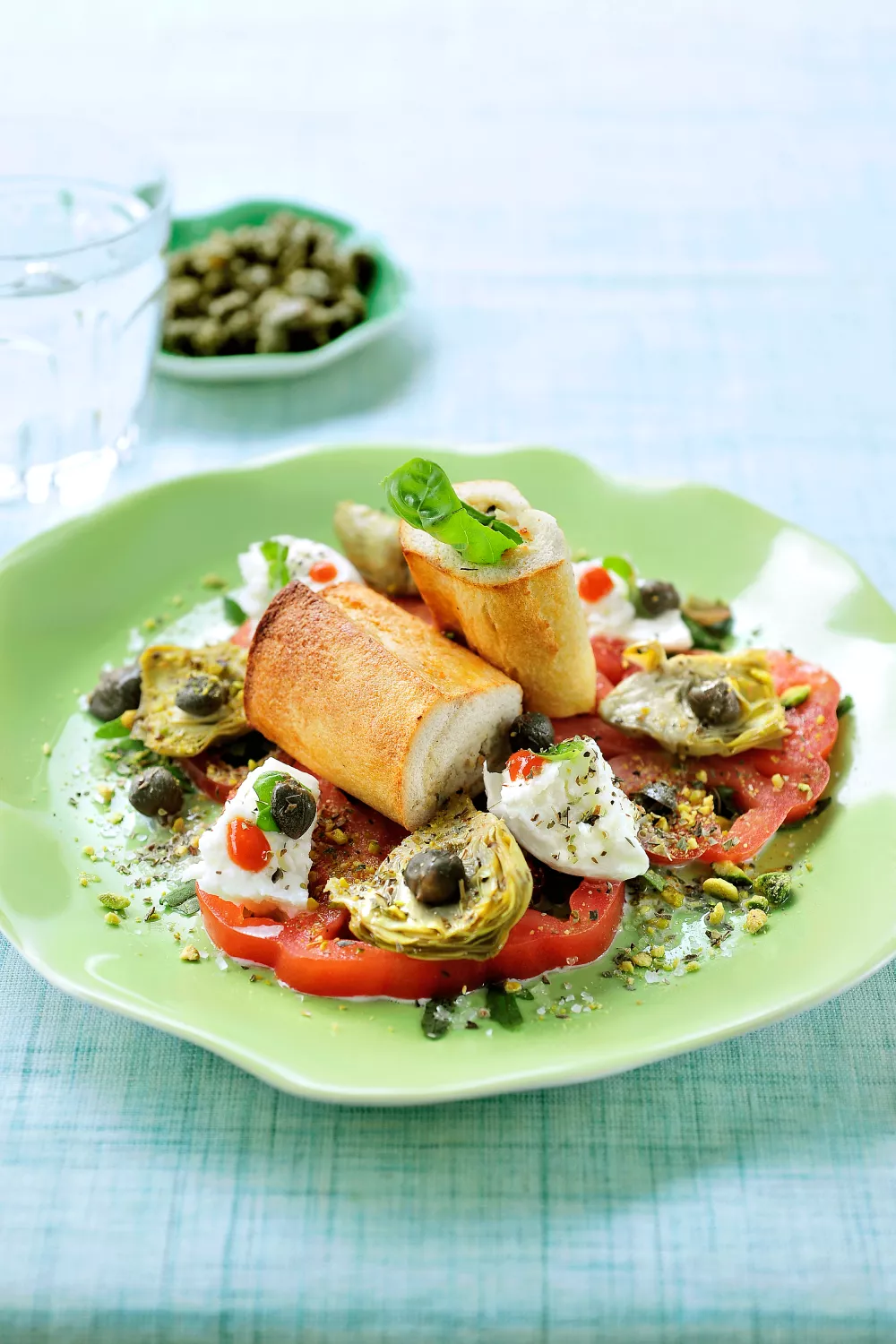 Verdeel de tomaten over de borden. Leg het brood in het midden. Schik er de artisjokken, kappertjes en burrata bij.