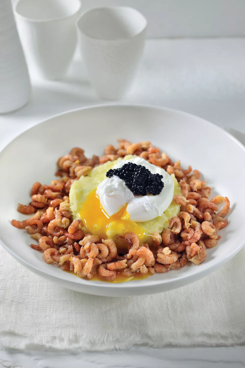 Romige polderaardappelpuree met zilte grijze garnalen, een zacht gepocheerd ei en geurige beurre noisette brengt een feestelijke doch hartelijke smaakbeleving op tafel. De puree wordt gestampt en door een zeef gehaald en opgekruid met karnemelk, boter, nootmuskaat en fijngesnipperde bieslook. Ideaal als elegant voorgerecht of smaakvol borrelhapje bij een lentelunch of feestelijk diner.