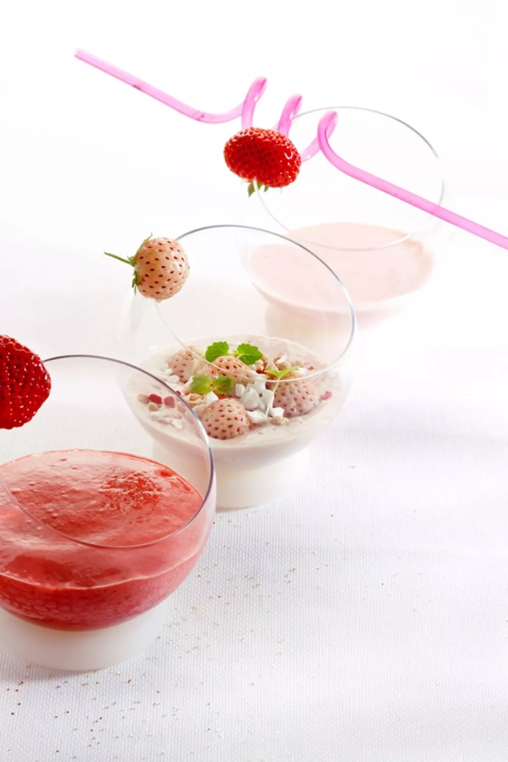 Spuit de espuma in glaasjes. Werk af met een takje munt en een aardbeitje.