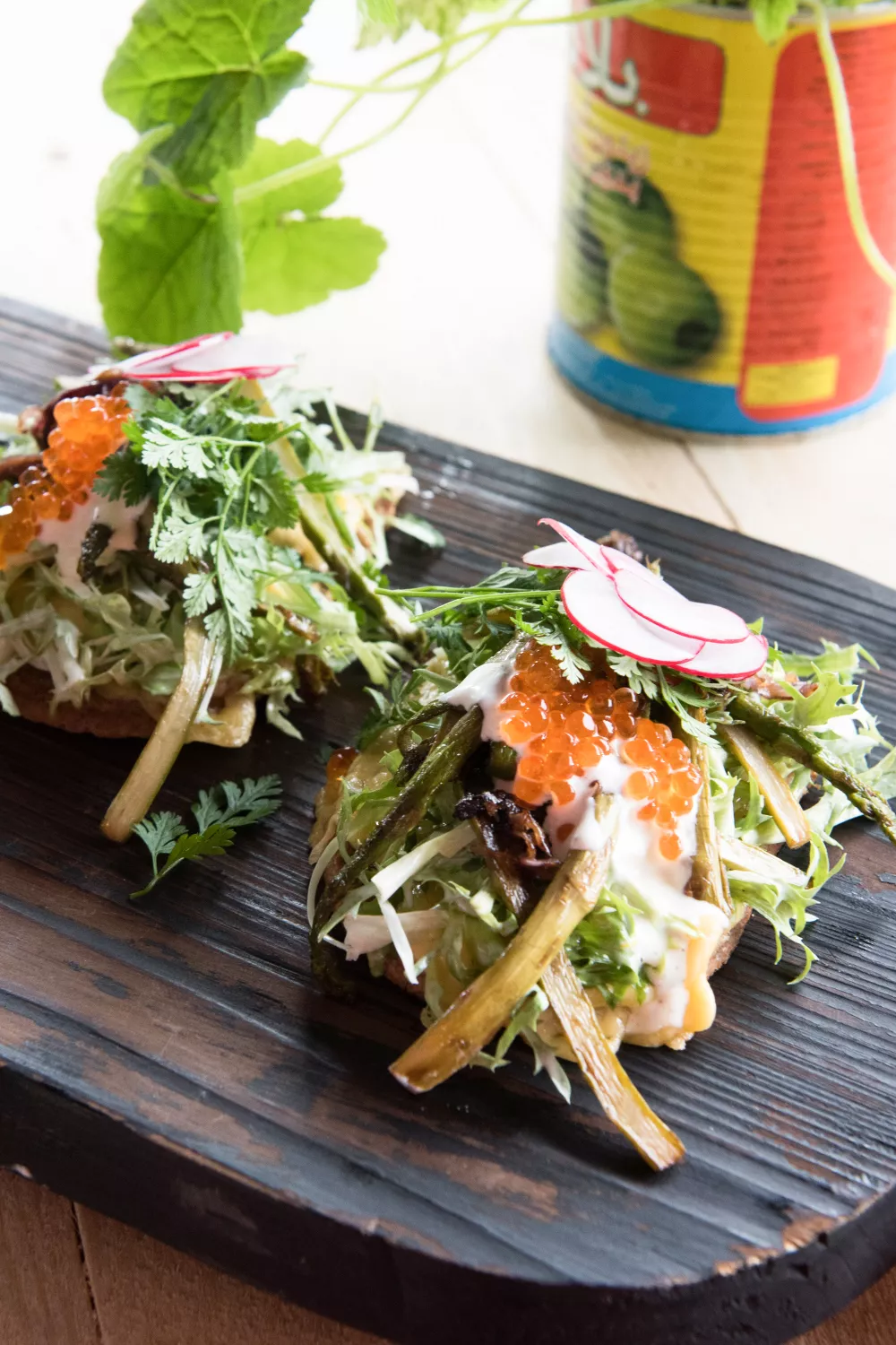 Deze frisse smørrebrød met romige tonijnsalade combineert gesmolten kaas en krokant donker brood met gebakken mini groene asperges en gekaramelliseerde rode ui voor een knapperige en hartige smaakbeleving. Een frisse zure room dressing met citroen en kappertjes geeft pit, terwijl plakjes radijs en kervel voor extra frisheid en kleur zorgen. Snel te maken en perfect als lente lunch, borrelhap of lichte picknick dankzij technieken als karamelliseren, bakken en kort grillen.