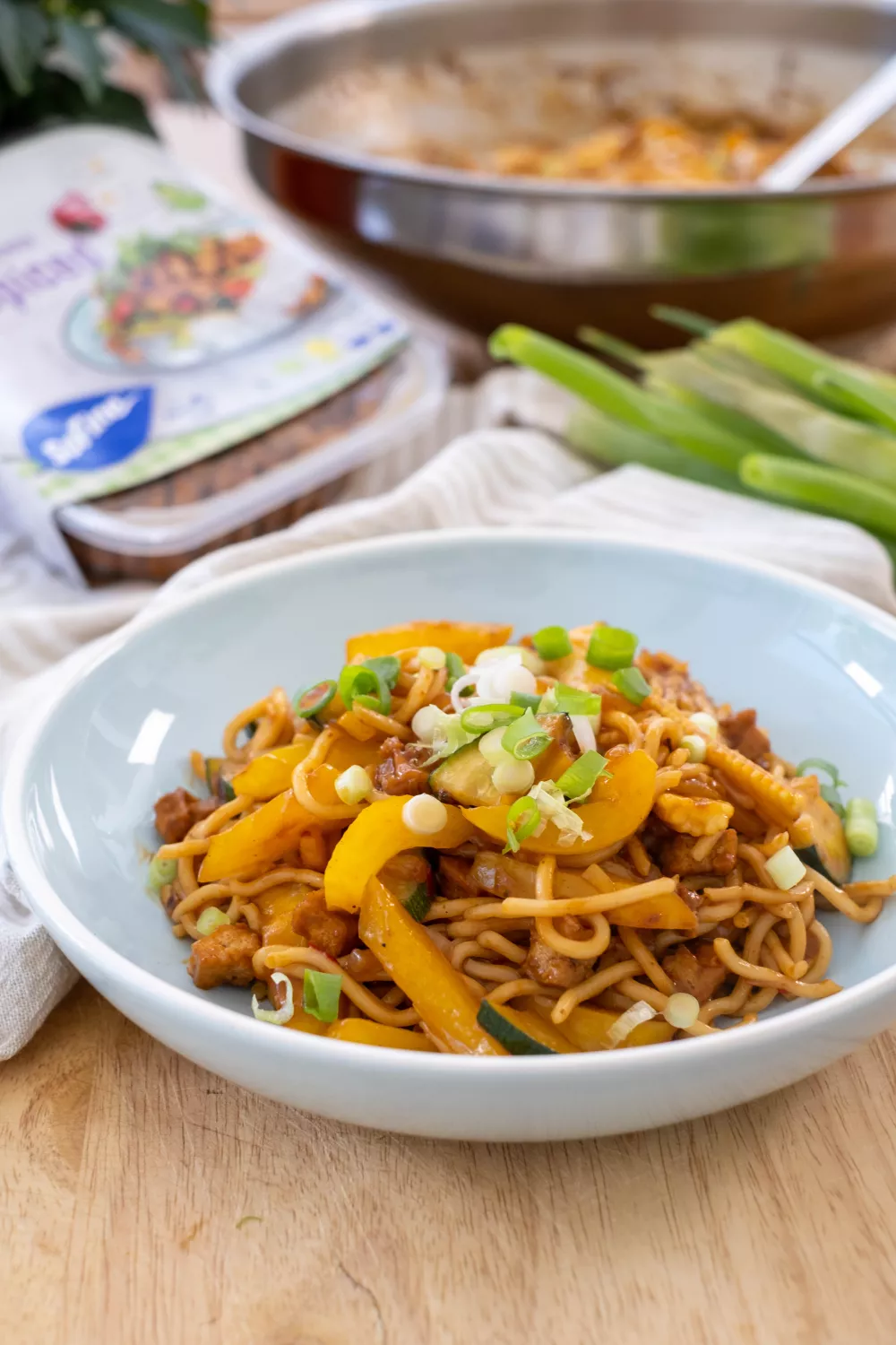Heerlijke snelle wokschotel met noedels en zachte minuten tofu in een zoet en pittig sausmengsel van hoisinsaus, sojasaus en sinaasappel. Knapperige courgette, gele paprika en mini maïs geven kleur en bite, afgewerkt met fijngehakte lente-ui. Perfect als doordeweekse noedelmaaltijd of licht Aziatisch geïnspireerd diner, klaargemaakt in één wokpan binnen enkele minuten.