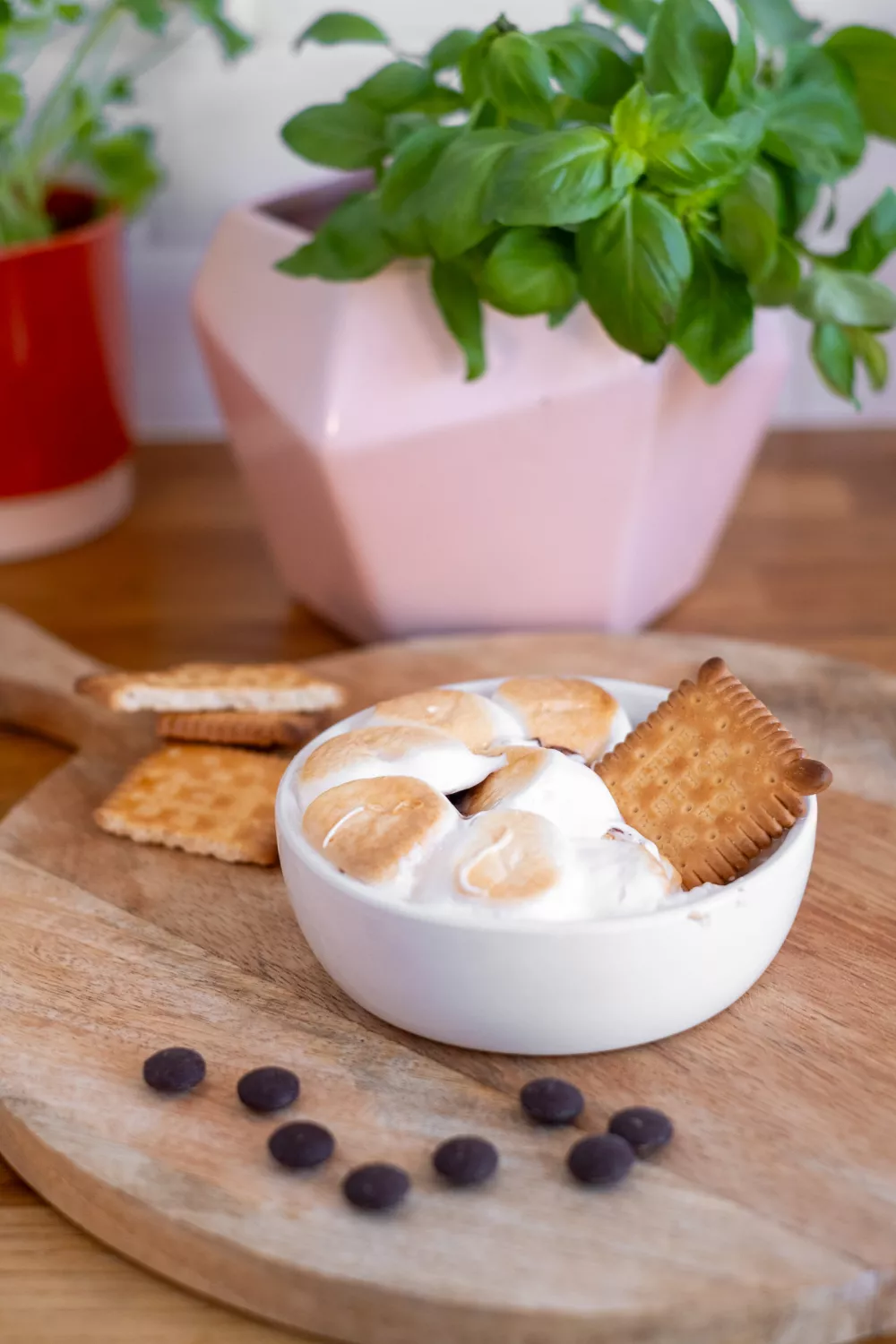 Deze snelle s'mores potjes brengen het warme kampvuurgevoel naar binnen met smeltende chocoladedruppels, goudbruine marshmallows en krokante koekjes om te dippen. In slechts enkele minuten in de microgolfoven en even onder de grill in de oven zet je een feestelijk dessert of zoete snack op tafel dat perfect is voor feestjes, kindertraktaties of gezellige avonden. Ideaal voor wie van eenvoudig bakken houdt, met een heerlijke combinatie van smeuïge chocolade en luchtige marshmallows.