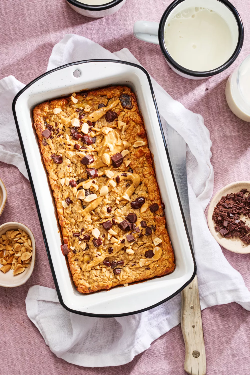 Deze Snickers baked oats combineren romige pindakaas, rijpe banaan, knapperige pinda's en pure chocoladechips tot een verwarmende, voedzame ontbijt- of brunchcake uit de oven. Met havermout, medjouldadels en ahornsiroop zet je snel een zoete, troostrijke snack op tafel die perfect past bij herfstige of winterse ochtenden. Eenvoudig te maken en ideaal voor een weekendontbijt of onderweg.