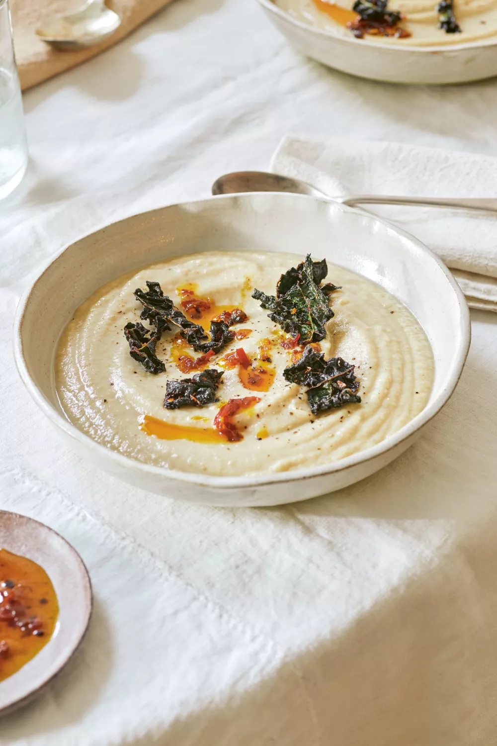 Serveer de soep in warme kommen, met de krokante boerenkoolchips en een scheutje chiliolie.