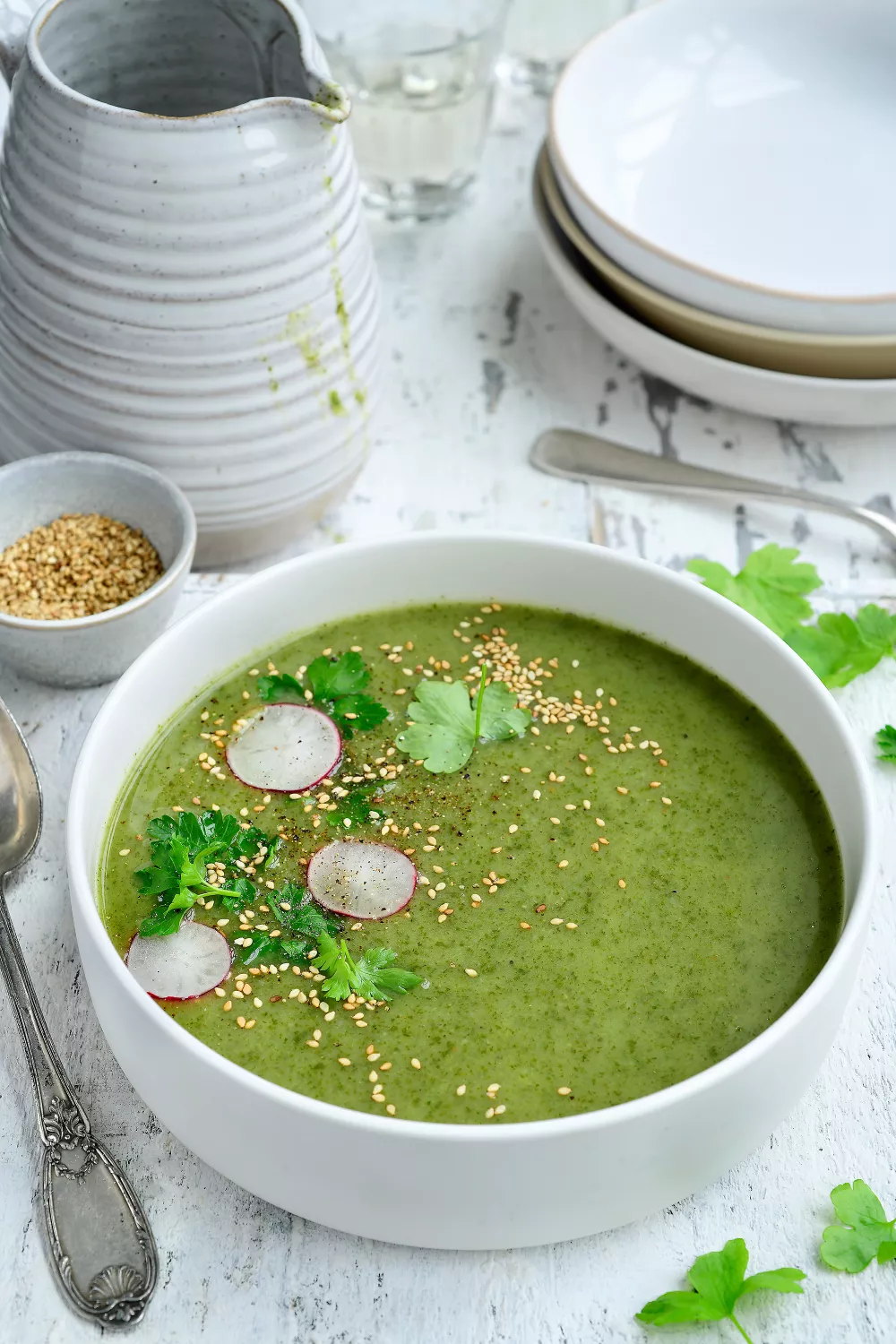 Romige soep van radijsloof waarin fris radijsblad en geraspte aardappel samen met ui en groentebouillon een milde, groene puree vormen. Ui en aardappel worden kort gestoofd en de soep zachtjes gesudderd en gepureerd, op smaak gebracht met een snufje currypoeder voor een subtiele kruidigheid. Perfect als licht lente of zomer soepje en als slimme restverwerking, af te werken met radijs schijfjes, peterselie en geroosterd sesamzaad.