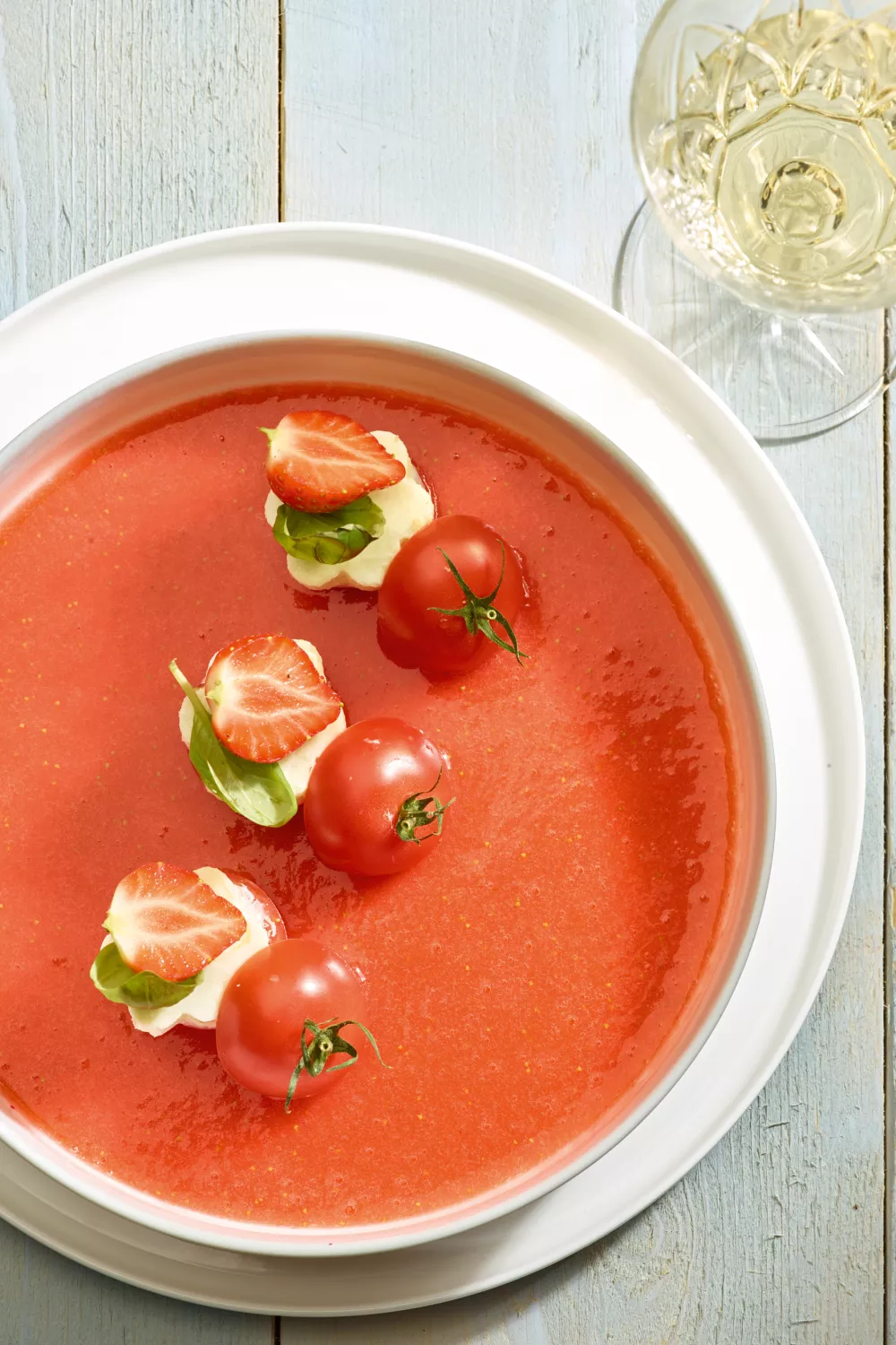 Snij de mozzarella in dunne plakjes. Steek de plakjes uit in dezelfde grootte als de kerstomaatjes. Snij de tomaten in twee en beleg één helft van elke tomaat met een schijfje mozzarella. Verdeel de soep over de 6 borden. Leg de halve tomaatjes belegd met de mozzarella in de borden. Reken 3 tomaatjes per bord. Leg op elk schijfje mozzarella een blaadje basilicum en een halve aardbei. Leg de resterende helften van de tomaten ertegenaan, zoals op de foto.
