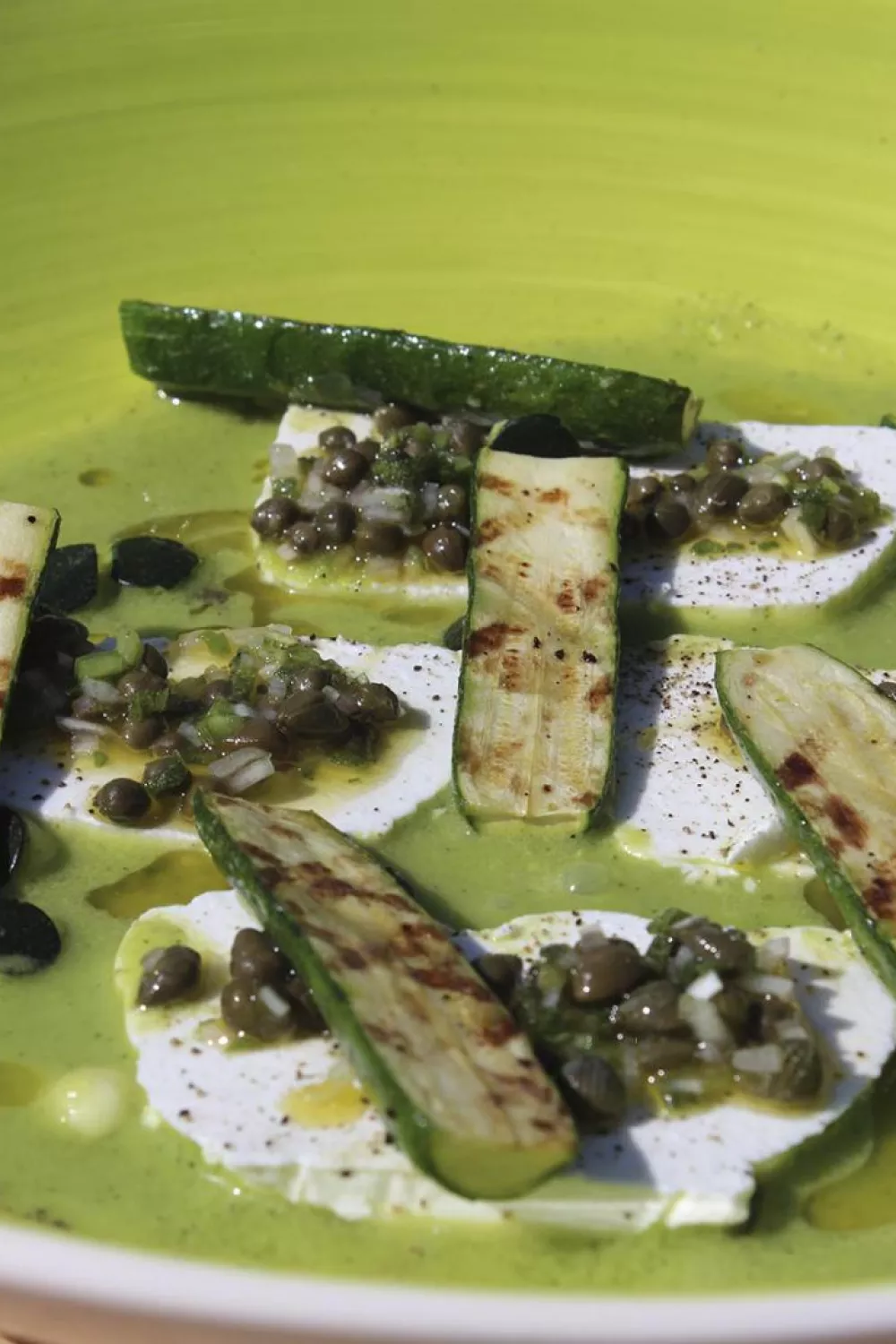 Snij de ricotta in plakjes. Leg enkele plakjes in een diep bord. Kruid met peper. Lepel de courgettesoep er rond. Werk af met de bolletjes van rauwe courgette, de vinaigrette en de gegrilde minicourgettes. Serveer met brood.