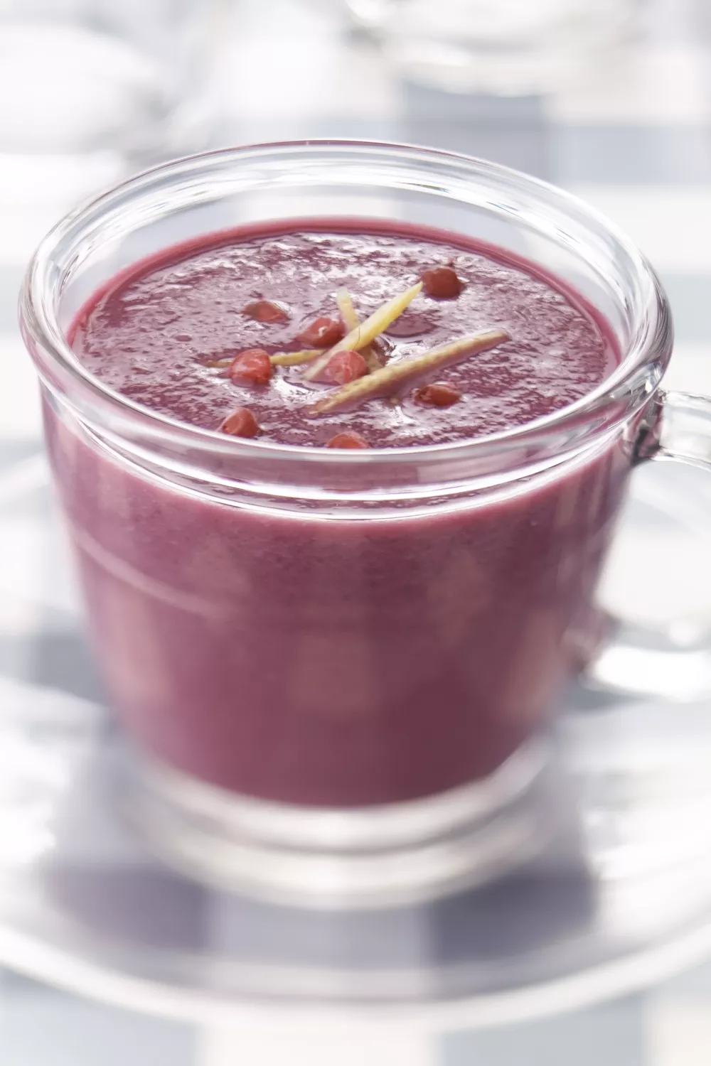 Een fris en fruitig soepje met aardse rode biet, levendige frambozen en geraspte rode kool dat romig wordt door volle yoghurt. Door de kool kort te koken, alles te blenderen en door een zeef te drukken ontstaat een zijdezachte koude soep met een frisse citroentwist. Perfect als lichte lunch, verfijnde starter bij een zomerdiner of verrassend hapje bij een borrel.
