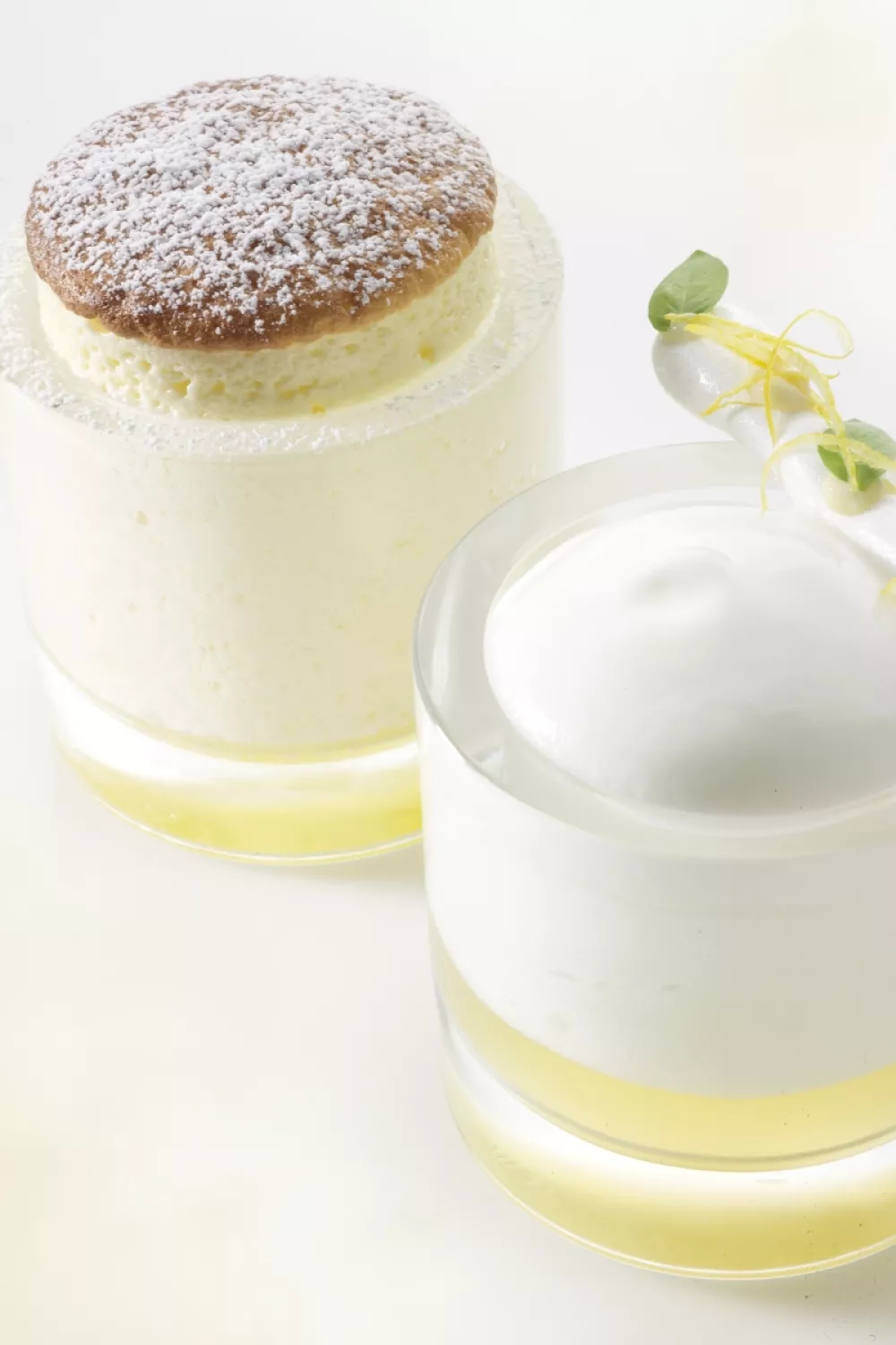 Luchtige citroensoufflés met romige plattekaas en een verfrissende Gin Fizz espuma zijn een feestelijk dessert voor lente en zomer. Opgeklopt eiwit en hete ovenstoom zorgen voor een hoge, zachte textuur, terwijl de koude gin espuma met limoenzeste een verrassende citruscocktail op het bord brengt. Ideaal voor speciale diners of als elegante afsluiter van een zomerse avond.