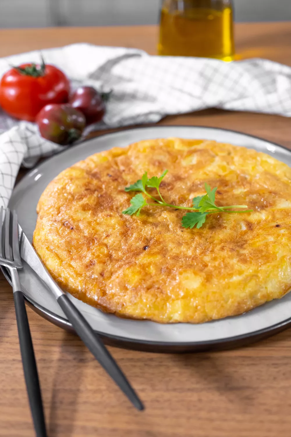 Deze klassieke Spaanse tortilla combineert zachte, goudbruine schijfjes aardappel met romige eieren voor een eenvoudig maar smaakvol comfortgerecht. Door de aardappelen kort te bakken in olijfolie en zonnebloemolie ontstaat een krokant randje, ideaal als tapas, lunch of warme brunch. Met slechts een antikleefpan en door de tortilla halverwege om te draaien heb je in een handomdraai een stevige, hartige omelet die goed past bij zomerse borrels of knusse herfstmaaltijden.