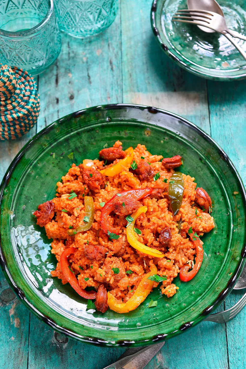 Deze Spaanse gebakken rijst met pittige chorizo, knapperige paprika's en zongedroogde tomaatjes is een verwarmend mediterraan eenpansgerecht vol karakter. De risottorijst wordt langzaam gaargekookt in passata en kippenbouillon zodat hij romig blijft terwijl de chorizo zijn aroma afgeeft. Perfect voor een snel familiediner of een gezellige herfstavond.