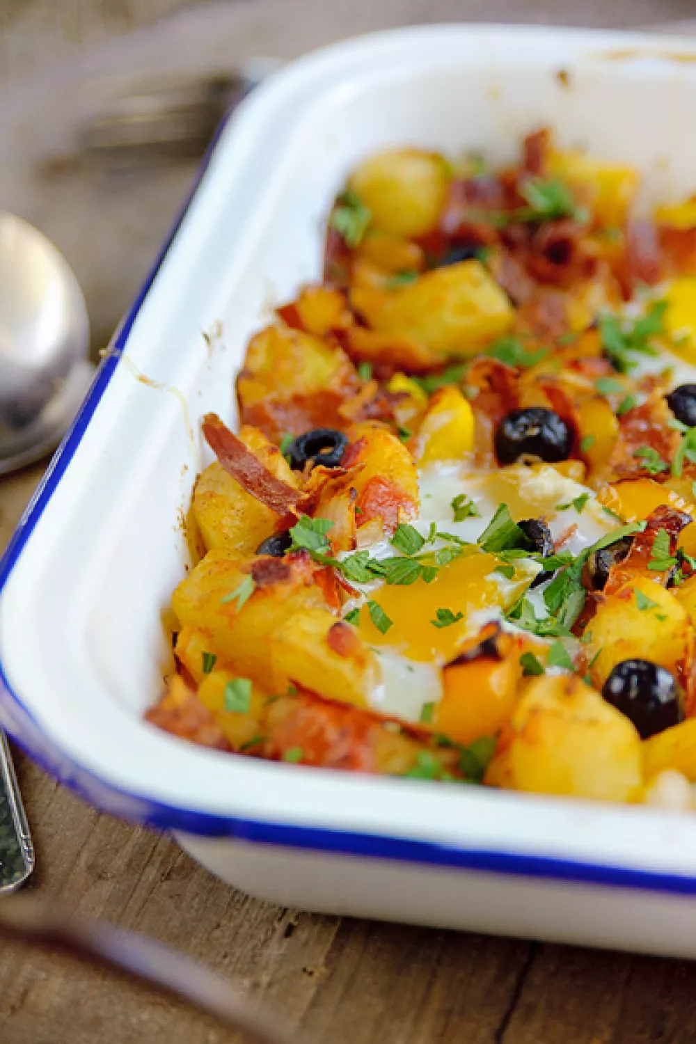 Zin in een hartige Spaanse ovenschotel voor het ontbijt of een zonnige weekendbrunch? Knapperig spek, paprika, tomaat, ui en knoflook sudderen met beetgare aardappelen en olijven tot een rijke groentenmix, die in de oven verder gaart met eieren die net stollen. Een vleug paprikapoeder en frisse peterselie maken het tot comfort food voor elk seizoen, heerlijk met grof bruin brood.