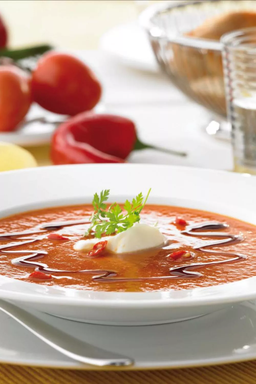 Deze Spaanse paprika-tomatensoep met geroosterde zoete paprika's, sappige tomaten uit blik en een verrassende scheut Kikkoman sojasaus brengt zomerse zoetheid en subtiel umami-volle smaak samen. Zacht gesudderd op het fornuis en kort gepureerd tot een romige, fluweelachtige textuur, afgewerkt met crème fraîche en fijngehakte chili voor extra pit. Ideaal als verwarmende lunch, licht diner of tapas-achtig voorgerecht in elk seizoen.