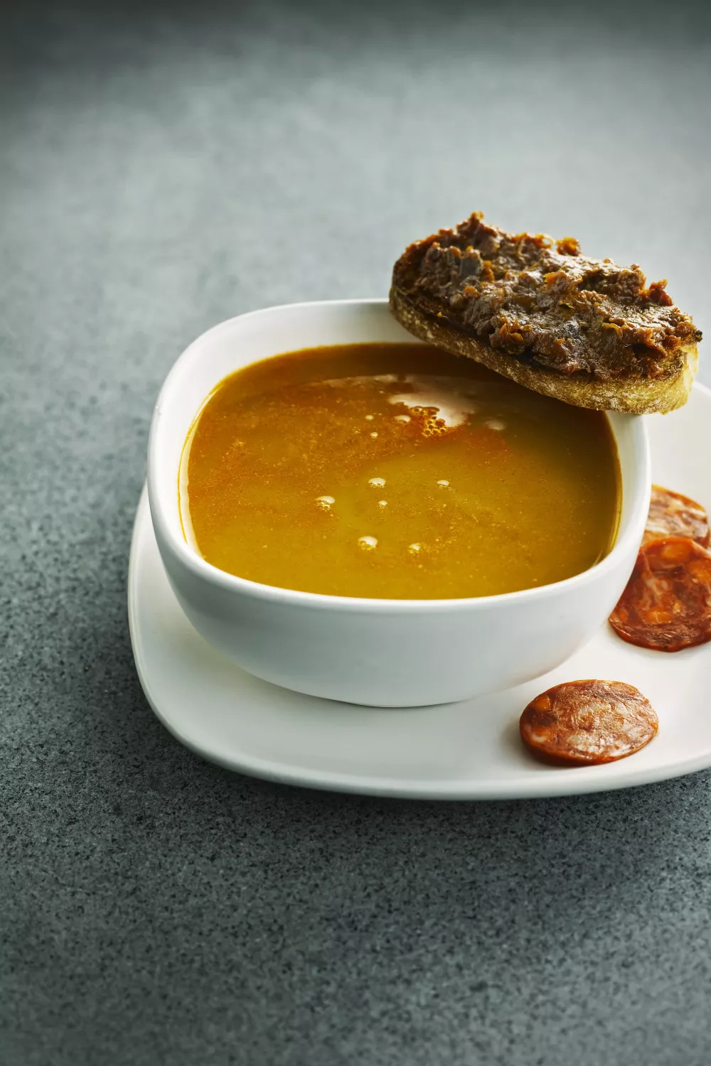 Deze Spaanse soep met kikkererwten en chorizo is verwarmend comfortfood, ideaal voor een frisse herfst of winteravond. Ui, look en koriander worden kort meegebakken, daarna laat je alles zacht pruttelen in krachtige vleesbouillon en mix je tot een fluweelzachte kom. De krokante plakjes chorizo geven een pittige bite, perfect als hartig voorgerecht of snelle doordeweekse maaltijd.