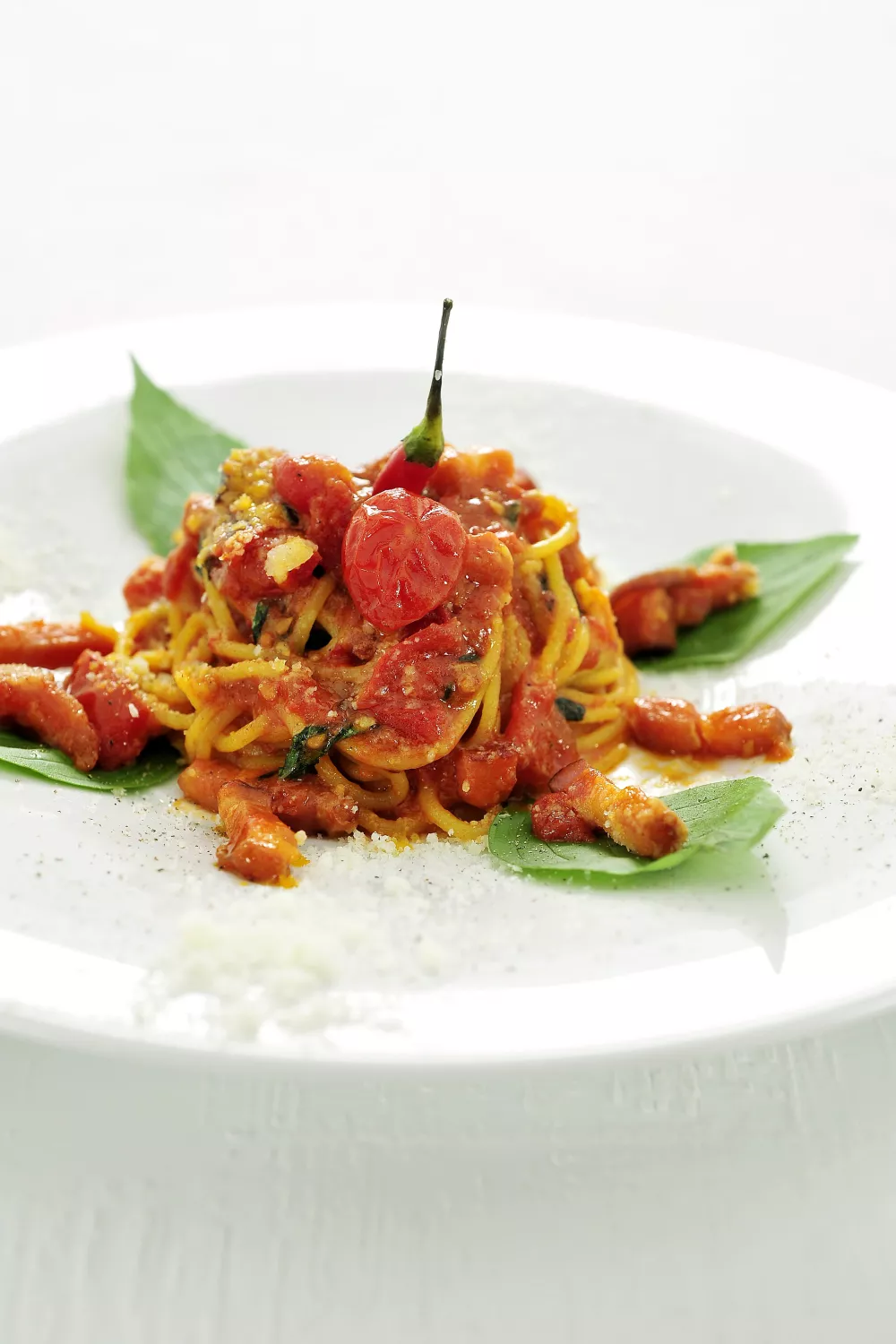 Spaghetti all Amatriciana, een Romeinse klassieker, brengt al dente pasta met gerookte varkenswang, zoete tomaten en romige pecorino romano samen in een pittige saus met knoflook en rode peper. Je maakt het extra feestelijk door zelf pastadeeg te kneden, te laten rusten en door de pastamachine te halen, terwijl de saus rustig pruttelt met basilicum. Perfect als hartig hoofdgerecht voor een zomerse avond of een gezellig etentje met vrienden.