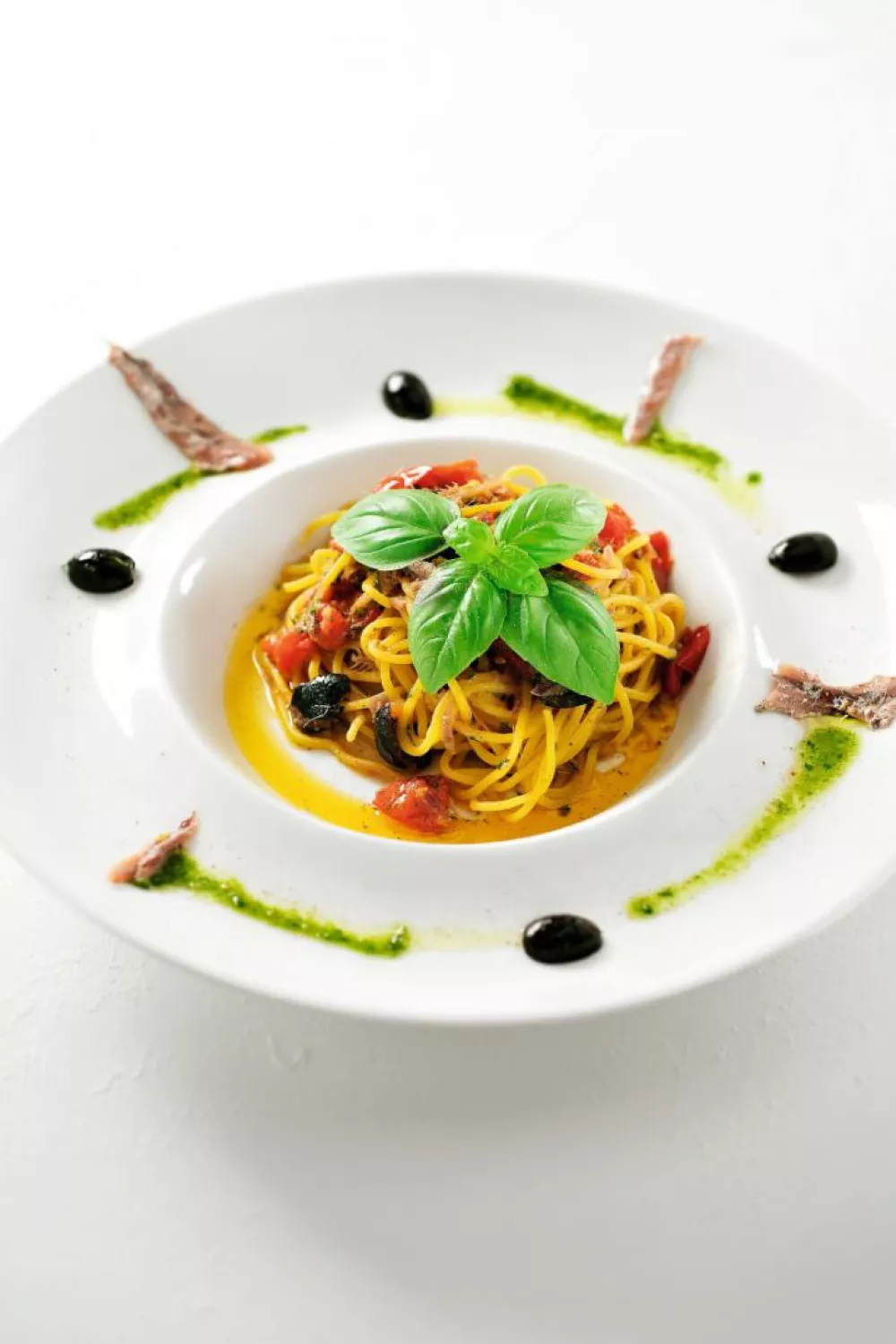Trek met een penseel enkele strepen pesto op het bord, leg de gebakken ansjovisjes erbij. Schep de pasta met saus erop en werk af met basilicum, olijfolie en peper.