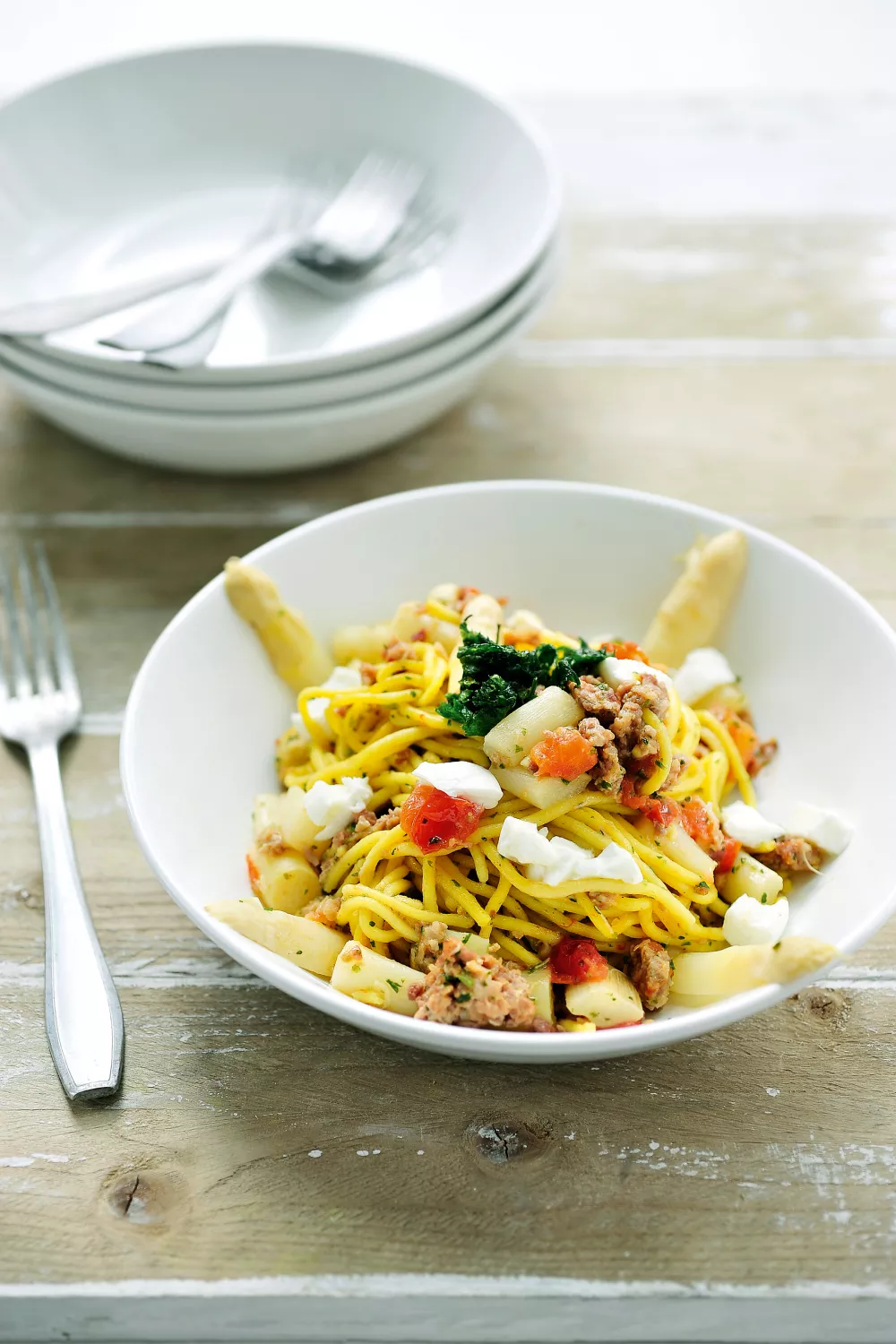 Voeg de gekookte spaghetti bij de saus. Zorg dat hij nog niet helemaal beetgaar is, zodat het zetmeel van de spaghetti de saus kan binden. Serveer met de aspergepunten en blokjes buffelmozzarella. Kruid af met een draai van de pepermolen.